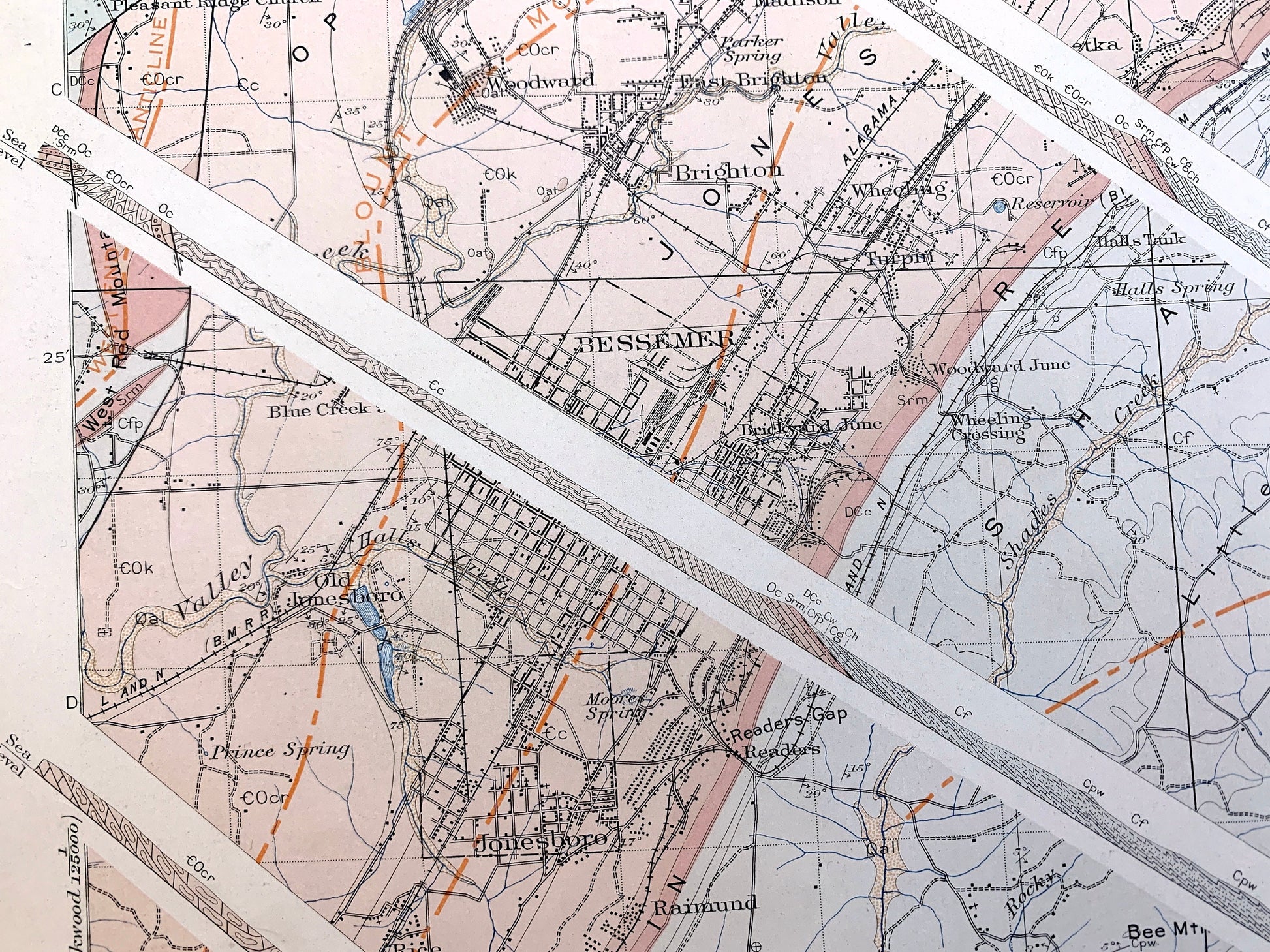 Points of Interest: Jefferson County, Shelby County, Opossum Valley, Sand Mountain, Red Mountain, Pine Ridge, Cahaba Valley, Cahaba River, New Hope Mountain, Double Mountain, Bee Ridge, Owens Mountain, Jones Valley, Black Warrior River, Arkadelphia Mountain, Shades Mountain, Flat Ridge, Shades Valley, and lots more hills, mountains, creeks, towns, roads and train tracks.