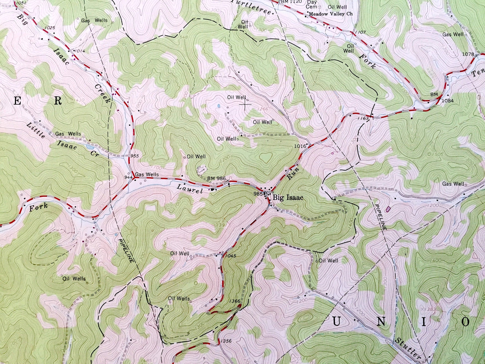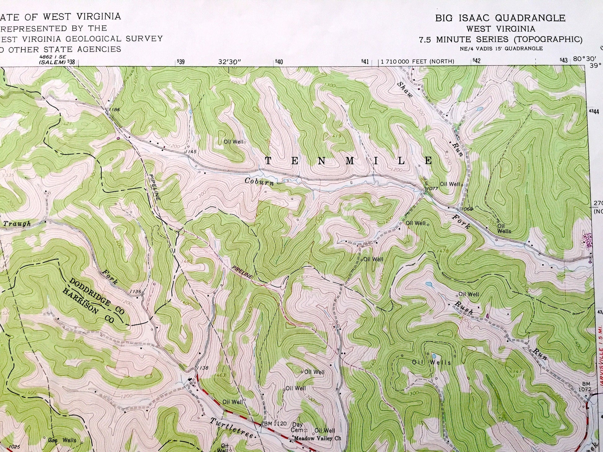 Beautiful, antique map of Big Isaac, West Virginia and surrounding Harrison County, Lewis County and Doddridge County areas. This is an authentic 1964 edition, 1977 print from the U.S. Geological Survey and NOT a computer reproduction.