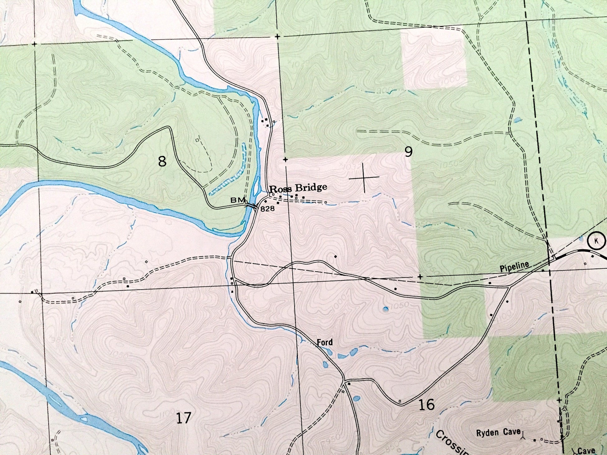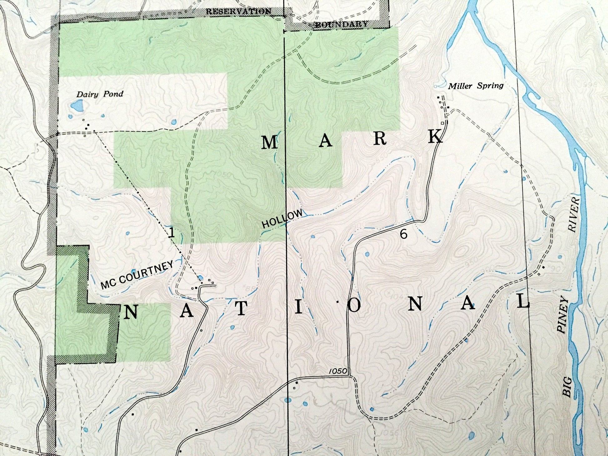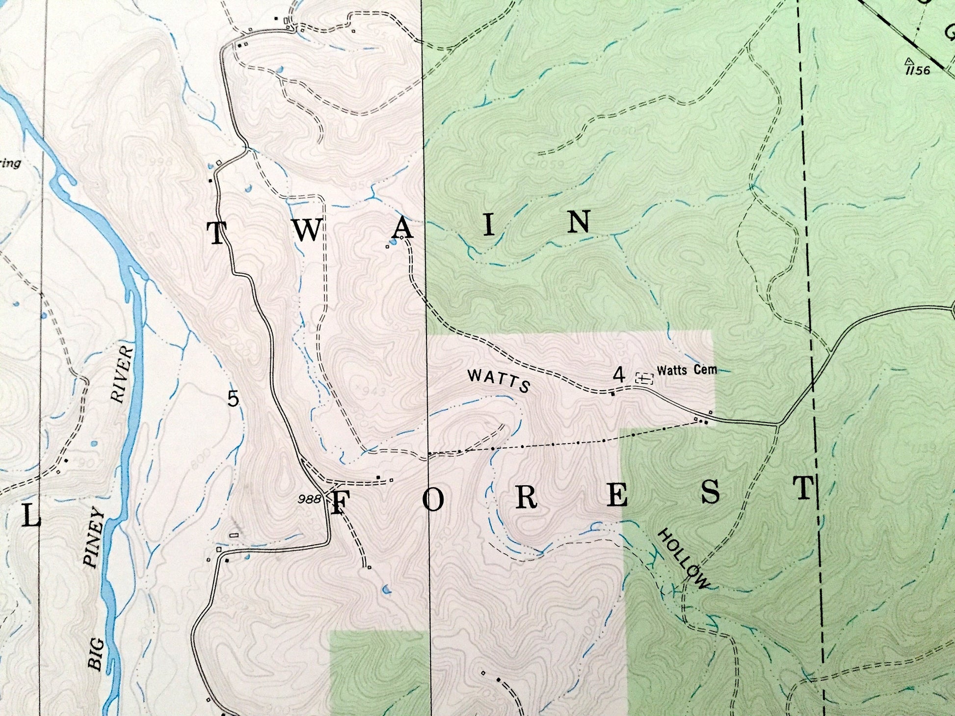 Points of Interest: Mark Twain National Forest, Fort Leonard Wood Military Reservation, Democrat Ridge, Happy Hollow Beach, Ryden Cave, Big Piney River, Wildcat Shoal, Stone Mill Spring, Miller Spring, Dairy Pond, Falls Hollow, Wildcat Hollow, McCourtney Hollow, Crossing Hollow, Watts Hollow, Spring Hollow, Spring Creek, Little Bald Ridge Creek, and many more hills, streams, ponds, houses, schools, railroads, churches and roads.