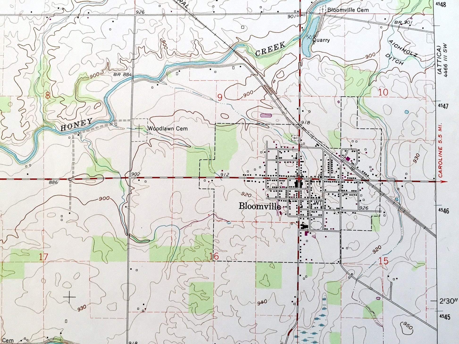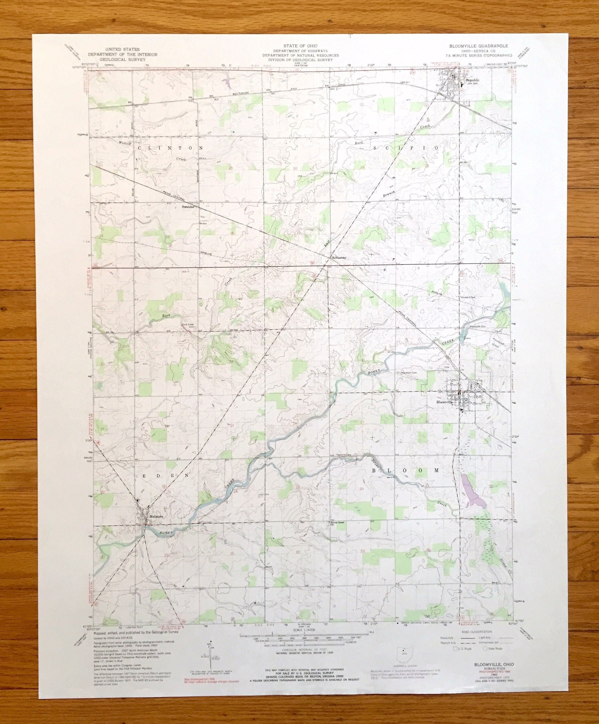 Beautiful, antique map of Bloomville, Ohio and surrounding Seneca County area. This is an authentic 1960 edition, 1973 print from the U.S. Geological Survey and NOT a computer reproduction.