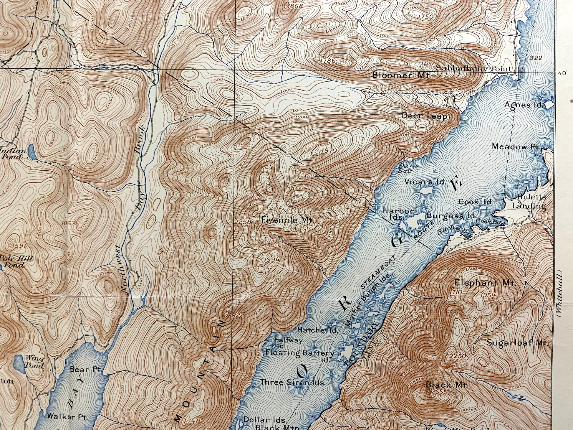 See what The Adirondacks and Lake George looked like over 120 years ago. Lots of intricate details and geological contours. Map even has little squares for every house that existed at the time. The USGS cartographers were very thorough back then! On the back is a description of topographic symbols and map guide.
