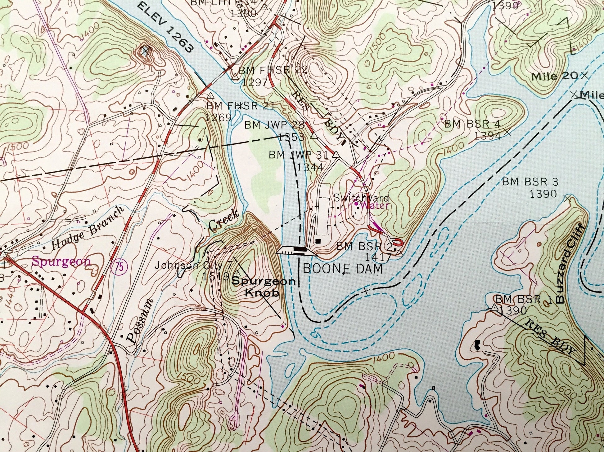 Beautiful, antique map of Boone Dam, Tennessee and surrounding Sullivan and Washington County areas. This is an authentic 1959 edition, 1978 print from the U.S. Geological Survey and NOT a computer reproduction.
