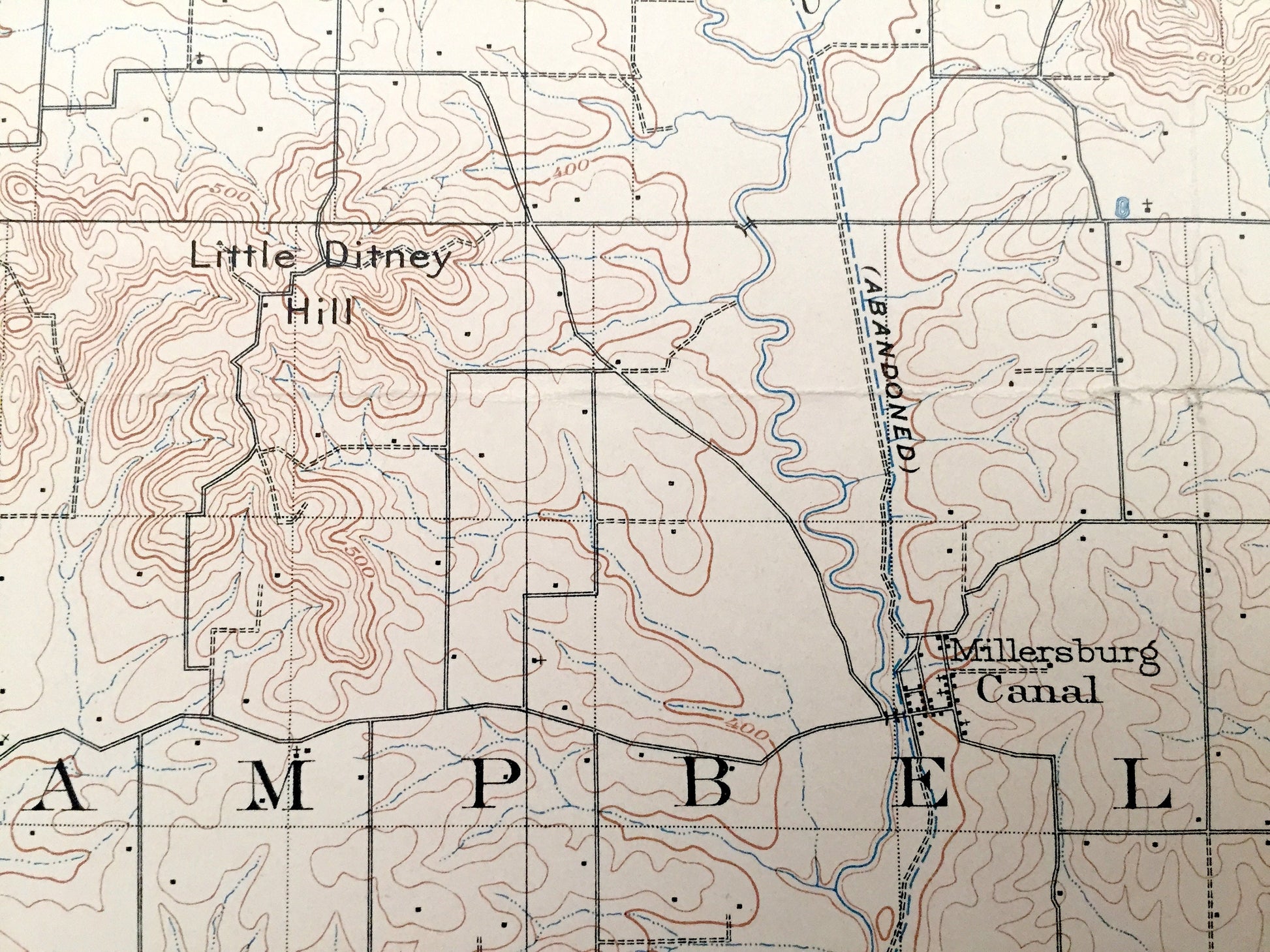 Points of Interest: Warrick County, Vanderburg County, Gibson County, Pike County, Little Ditney Hill, Dyson Knob, Ringham Hill, Limekiln Hill, Big Ditney Hill, Southern Railroad, Evansville and Indianapolis Railroad, and many more hills, brooks, towns, schools, churches, roads and train tracks.