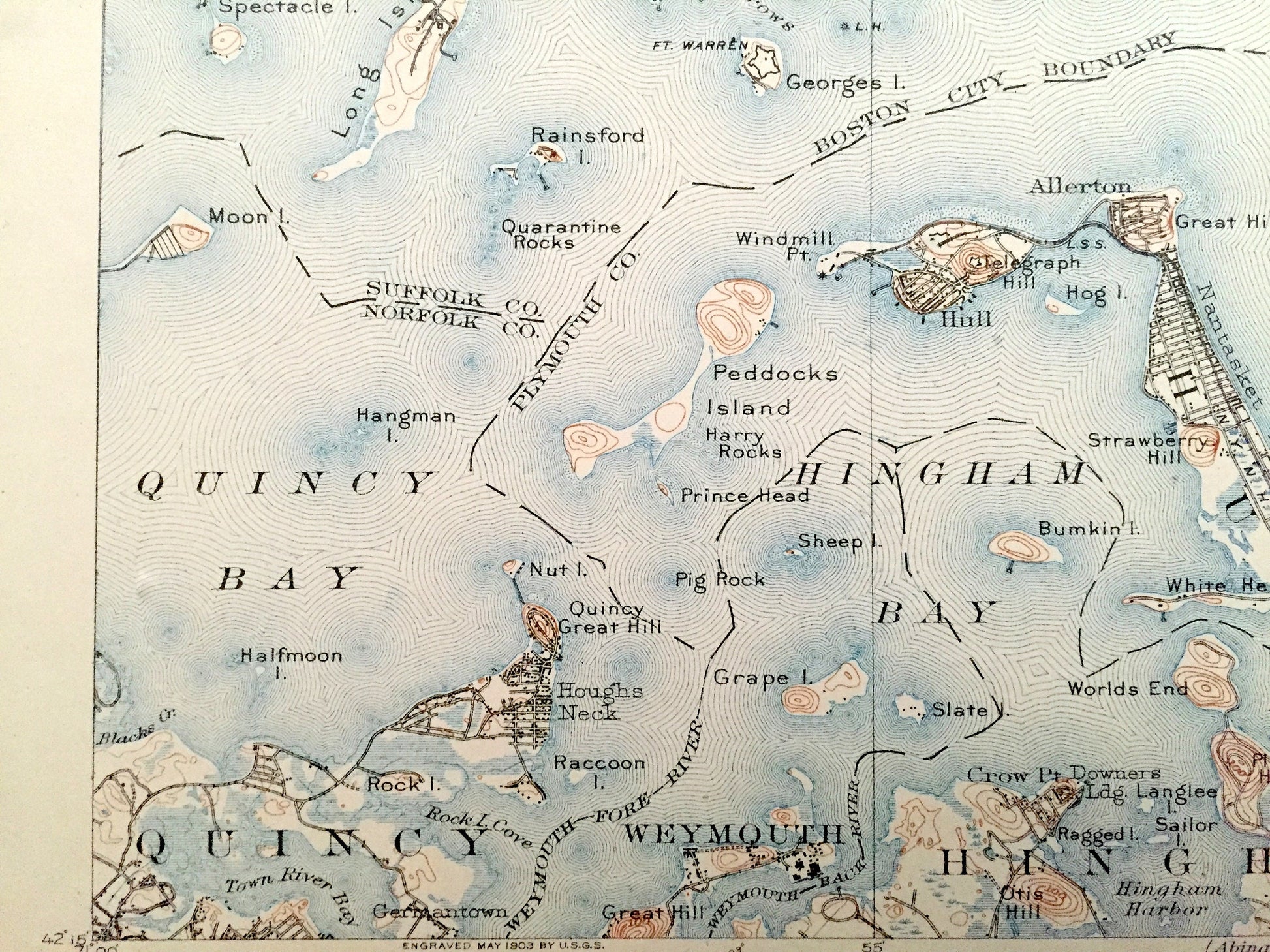 Beautiful, antique map of Boston Bay, Massachusetts including the surrounding towns of Winthrop, Revere, Saugus, Nahant, Lynn, Salem, Swampscott, Marblehead, Quincy, Hingham, Hull and Cohasset. This is an authentic 1903 edition, 1918 print from the U.S. Geological Survey and is NOT a computer reproduction.