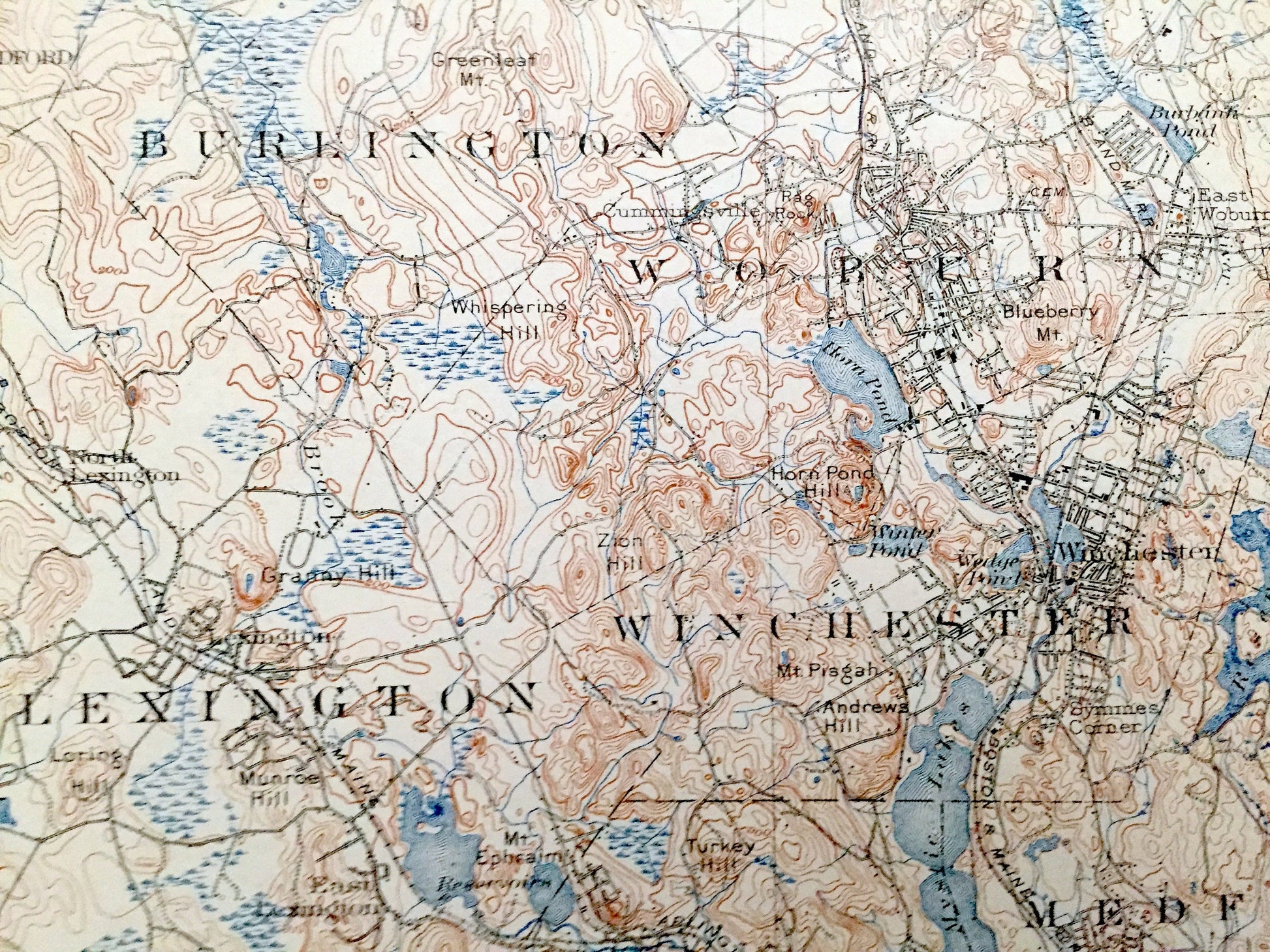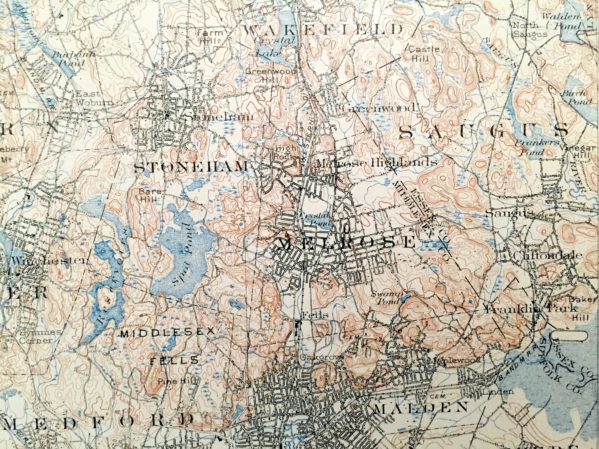 Points of Interest: Middlesex County, Essex County, Norfolk County, Suffolk County, Boston Harbor, Charles River, Mystic River, Fresh Pond, South Bay, Back Bay, Spy Pond, Mystic Lakes, Spot Pond, Neponset River, Horn Pond, Chestnut Hill Reservoir, Harvard University, Fort Winthrop, Castle Island, Thompson Island, Squantum, Quincy Bay, Commercial Point, Dorchester Bay, Crystal Lake, Horn Pond Hill, Mt. Ephraim, Loring Hill, Pranker Pond, Penny Brook, Saugus River, Mystic Park, Tufts College, Clarendon Hill, Granny Hill, Whispering Hill, Cedar Hill, Owl Hill, Walnut Hill, Bald Pate Hill, Mt. Auburn Cemetery, Beacon Hill, Boston Common, Savin Hill, Breeds Island, Malden River, Zions Hill, High Rock, US Marine Hospital, Middlesex Fells, New York New Hampshire & Hartford Railroad, Boston & Albany Railroad, Boston & Maine Railroad and lots more creeks, hills, mountains, houses, churches, schools, cemeteries, train tracks and roads.