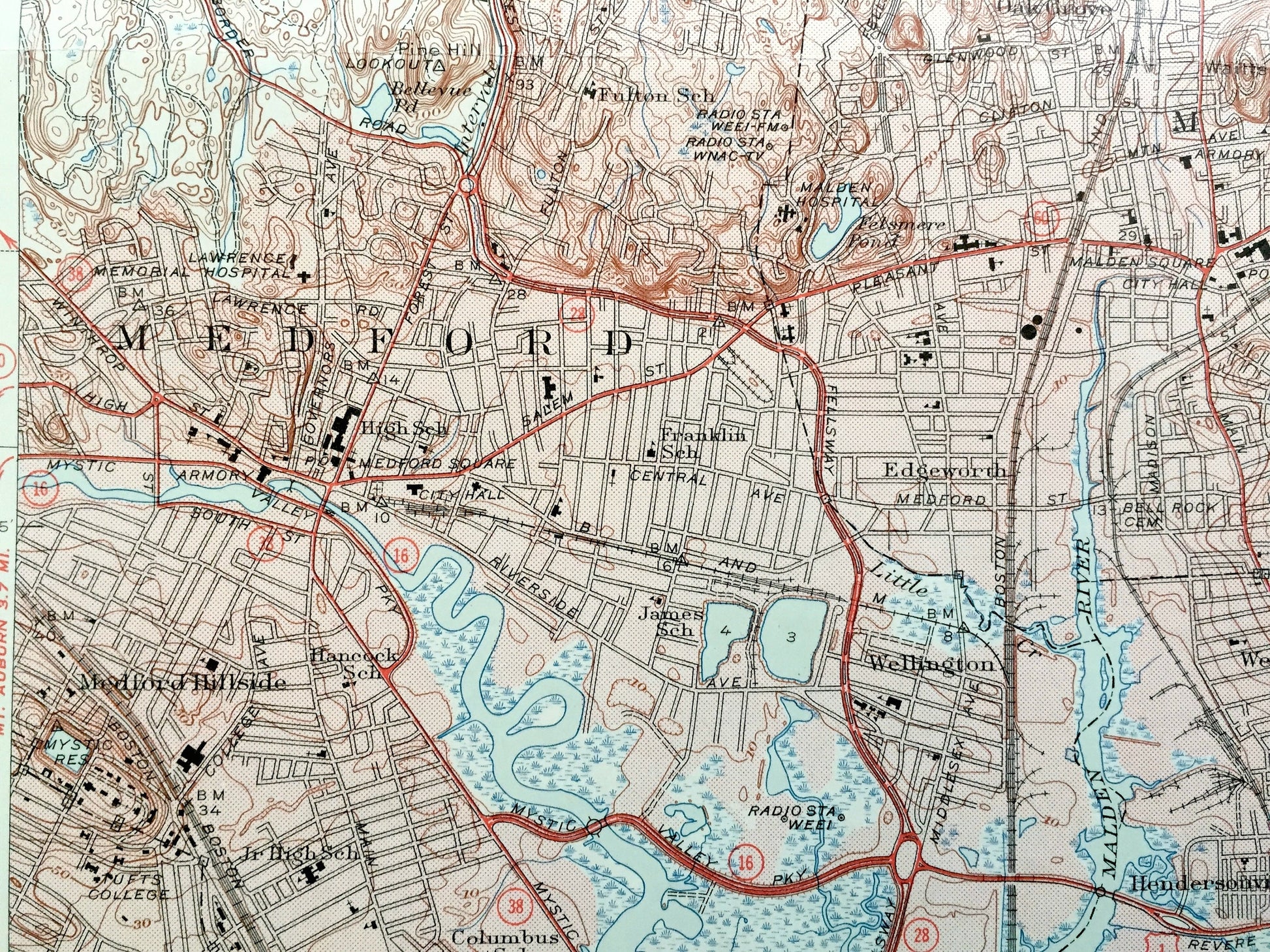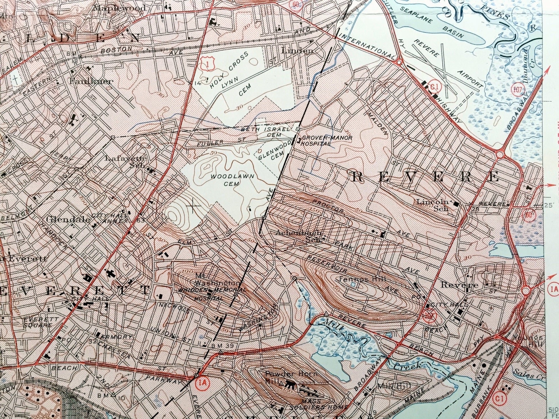 Points of Interest: Boston Harbor, Mystic River, Boston Inner Harbor, Chelsea Creek, Winchester Water Works, Spot Pond, Seaplane Basin, Crystal Lake, Prankers Pond, Walden Pond, Lynn Woods, Birch Pond, Pines River, Malden River, Logan International Airport, Fells Reservoir, Breakheart Reservation, Bear Hill Golf Club, Unicorn Golf Club, Lawrence Observatory, Tufts University, Harvard University, Radcliff College, Bunker Hill, US Naval Reservation, Sullivan Square, Naval Hospital, Suffolk Downs Park, Powder Horn Hill, and lots more hills, rivers, marshes, houses, schools, churches, roads and train tracks.