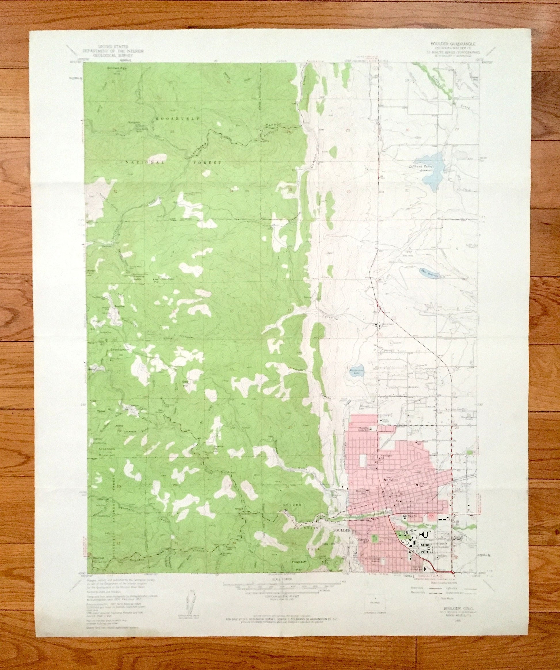 Beautiful, antique map of Boulder, Roosevelt National Park and surrounding Boulder County area. This is an authentic 1957 edition, 1959 print from the U.S. Geological Survey and not a computer reprint.