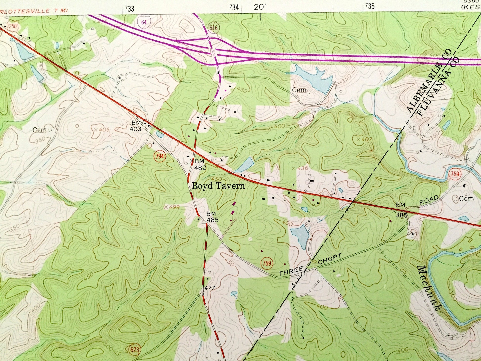 Points of Interest: Albermarle County, Fluvanna County, Louisa County, Lake Monticello, Rivanna River, Boston Creek, Mechunk Creek, Limestone Creek, Oliver Creek, Cedar Branch, and many more hills, creek, ponds, houses, schools, churches and roads.