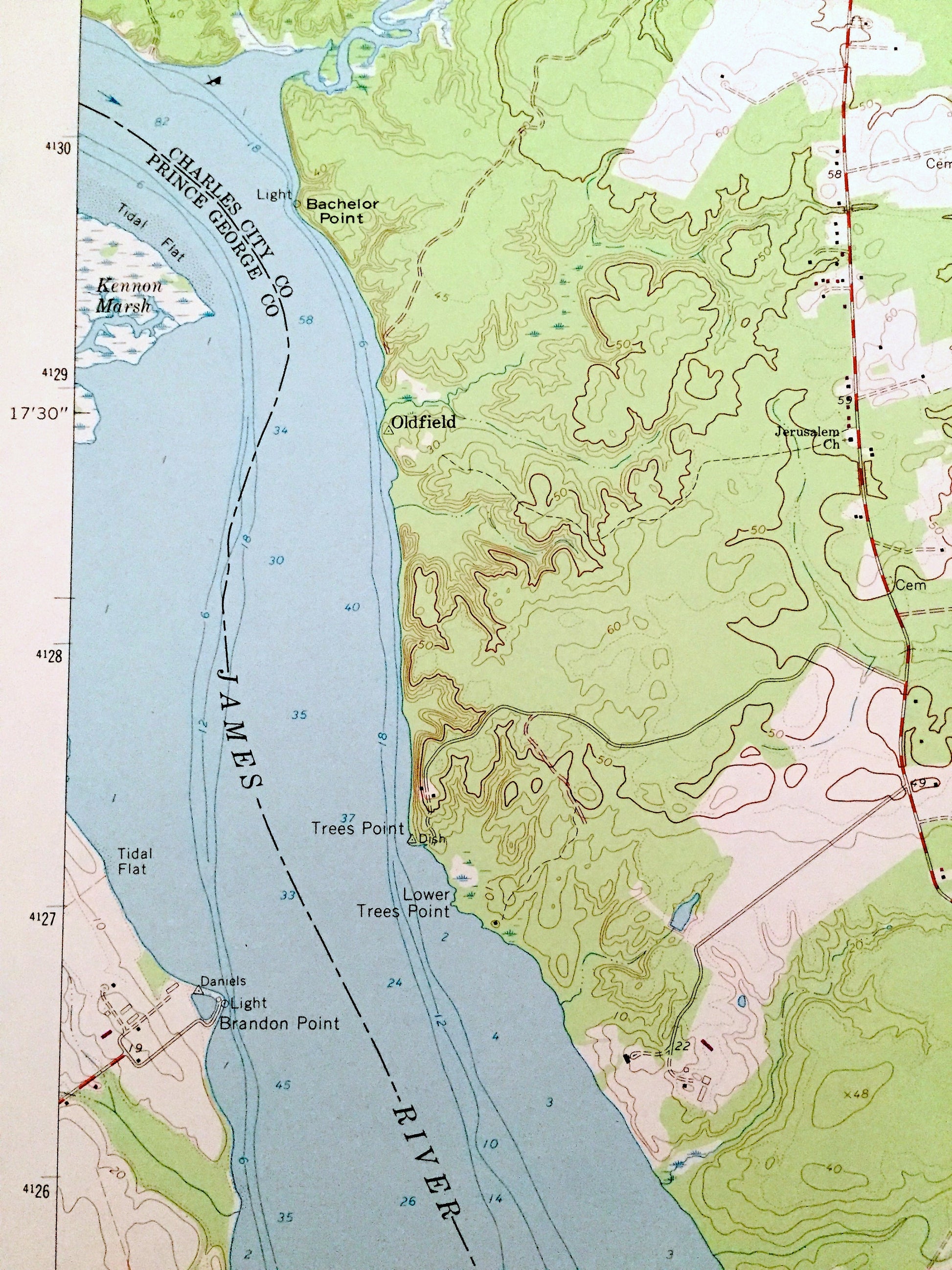 Points of Interest: Charles City County, James City County, James River, Chickahominy River, Chickahominy State Wildlife Management Area, Morris Creek, Tomahund Creek, Old Neck, Parsons Island, Big Marsh Point, Kennon Creek, Watts Point, Bachelor Point, Trees Point, and many more roads, creeks, churches and houses.