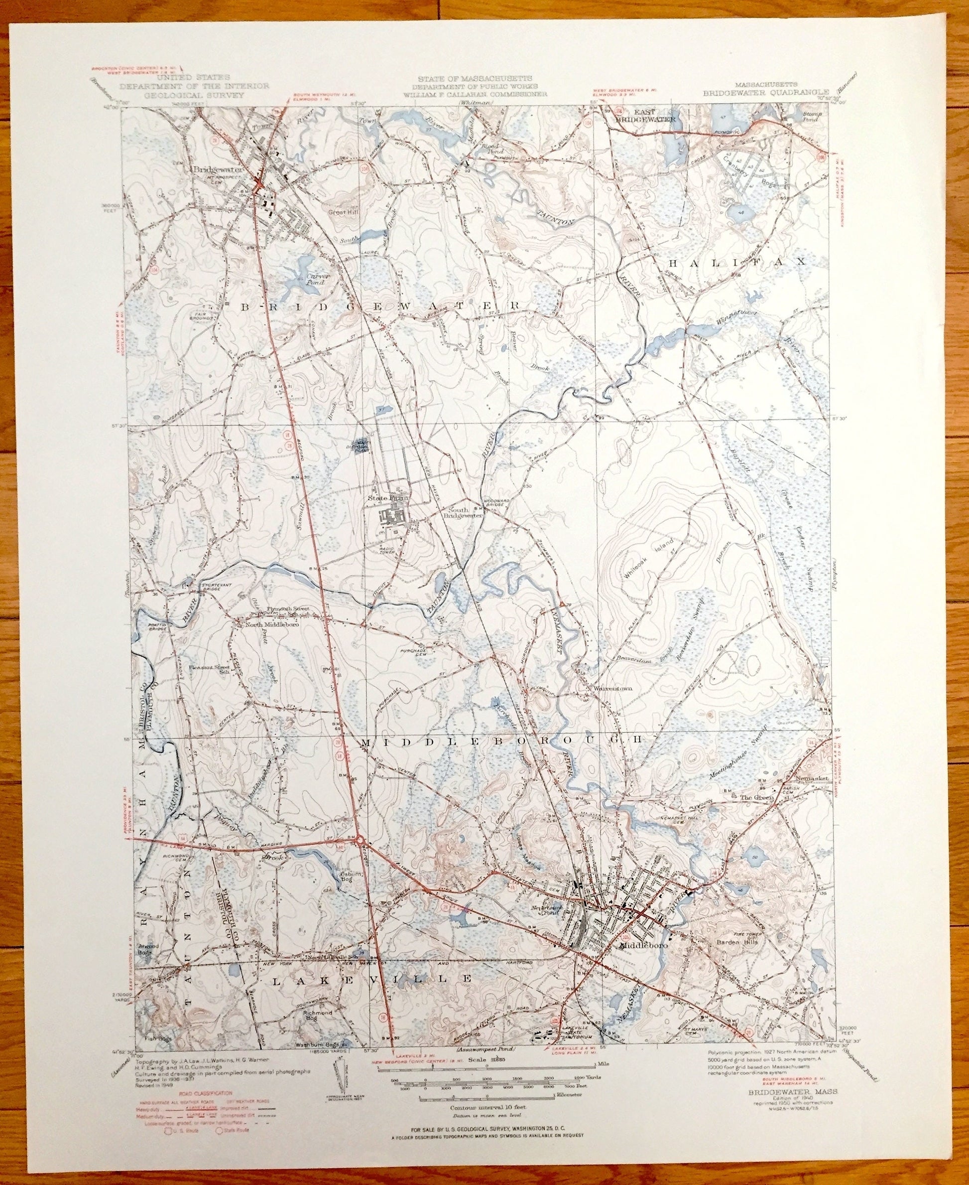 Beautiful, antique map of Bridgewater, Middleborough and Lakeville, Massachusetts. This is an authentic edition of 1950 print of 1940 survey data from the U.S. Geological Survey and NOT a computer reproduction.