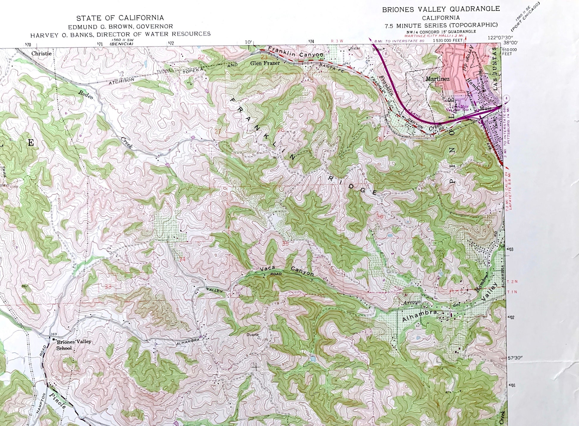 Points of Interest: Contra Costa County, Alameda County, Laguna de los Palos Colorados, Lake Anza, San Pablo Ridge, San Pablo Reservoir, El Sobrante, Sobrante Ridge, Briones Valley, Briones Reservoir, San Pablo Creek, Lafayette Reservoir, Acalanes, Happy Valley, Lafayette Ridge, Black Hills, La Boca de la Canada del Pinole, Bear Creek, Alhambra Valley, Arroyo Del Hambre Creek, Las Juntas, Franklin Canyon, Franklin Ridge, Pinole, Pinole Ridge, Oursan Ridge, Lawson Hill, Pinole Creek, Refugio Creek, and lots more hills, mountains, brooks, villages, schools, churches, canyons, roads and train tracks.