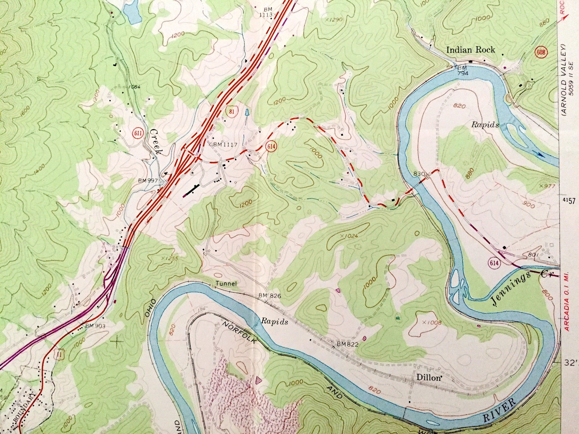Points of Interest: Botetourt County, Jefferson National Forest, James River, Bearwallow Creek, Back Creek Mountain, Purgatory Mountain, Green Spur, Mays Mountain, Cherry Orchard Gap, Hickory Hollow, Horseshoe Bend, The Gorge, Cove Mountain, Renick Run< The Knob, Purgatory Creek, Karnes Spring , and many more creeks, hills, houses and roads.