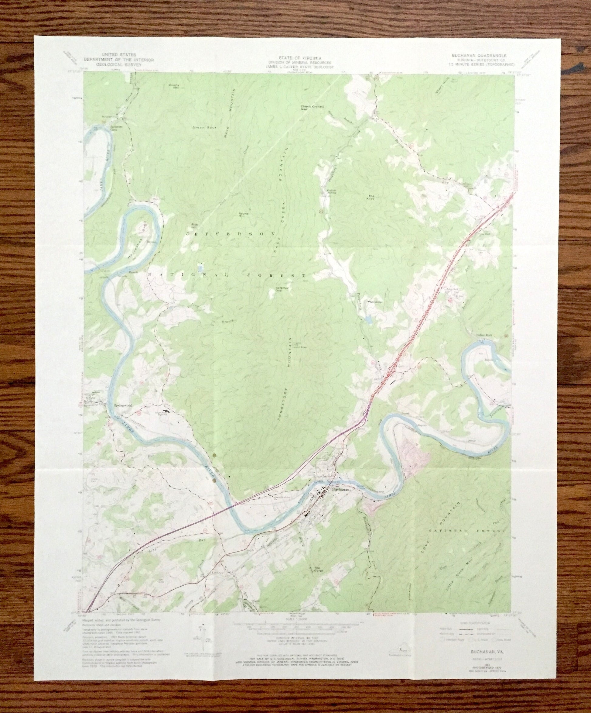 Beautiful, antique map of Buchanan, Virginia and surrounding Botetourt County area. This is an authentic 1961 edition, 1973 print from the U.S. Geological Survey and NOT a computer reproduction.