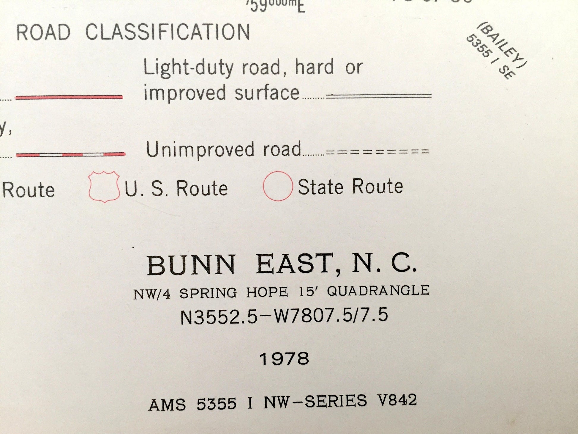 Beautiful, antique map of Bunn, Seven Paths, Daddysville, Pine Ridge, Hunts, Gold Valley Crossroads, and Tants Crossroads, North Carolina. This is an authentic 1978 print from the U.S. Geological Survey and NOT a computer reproduction.