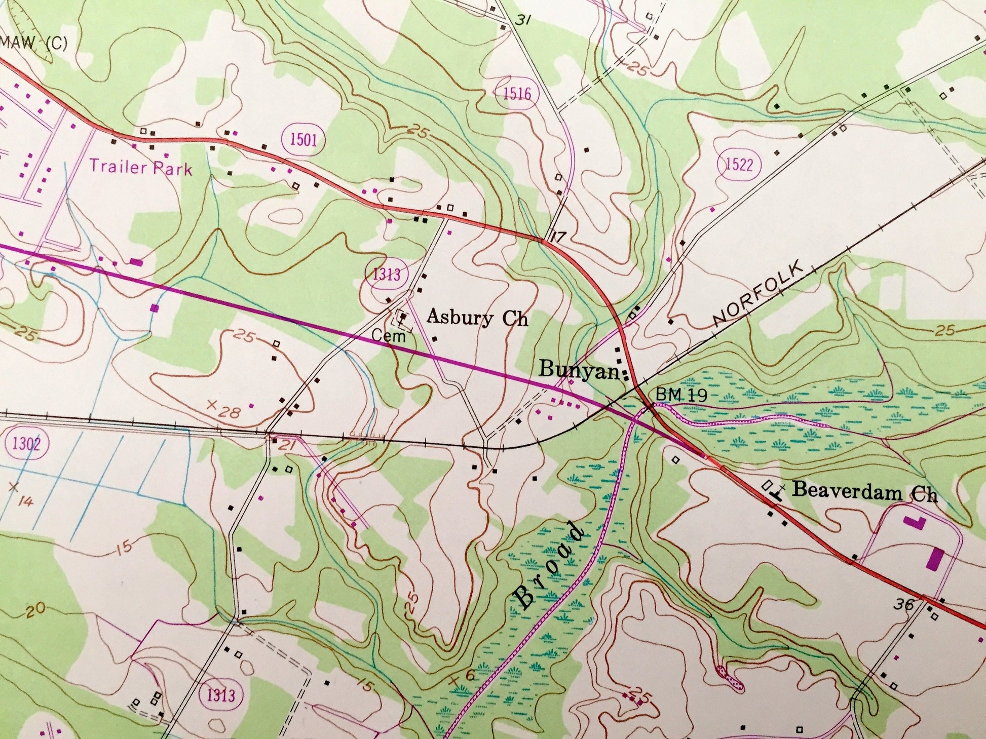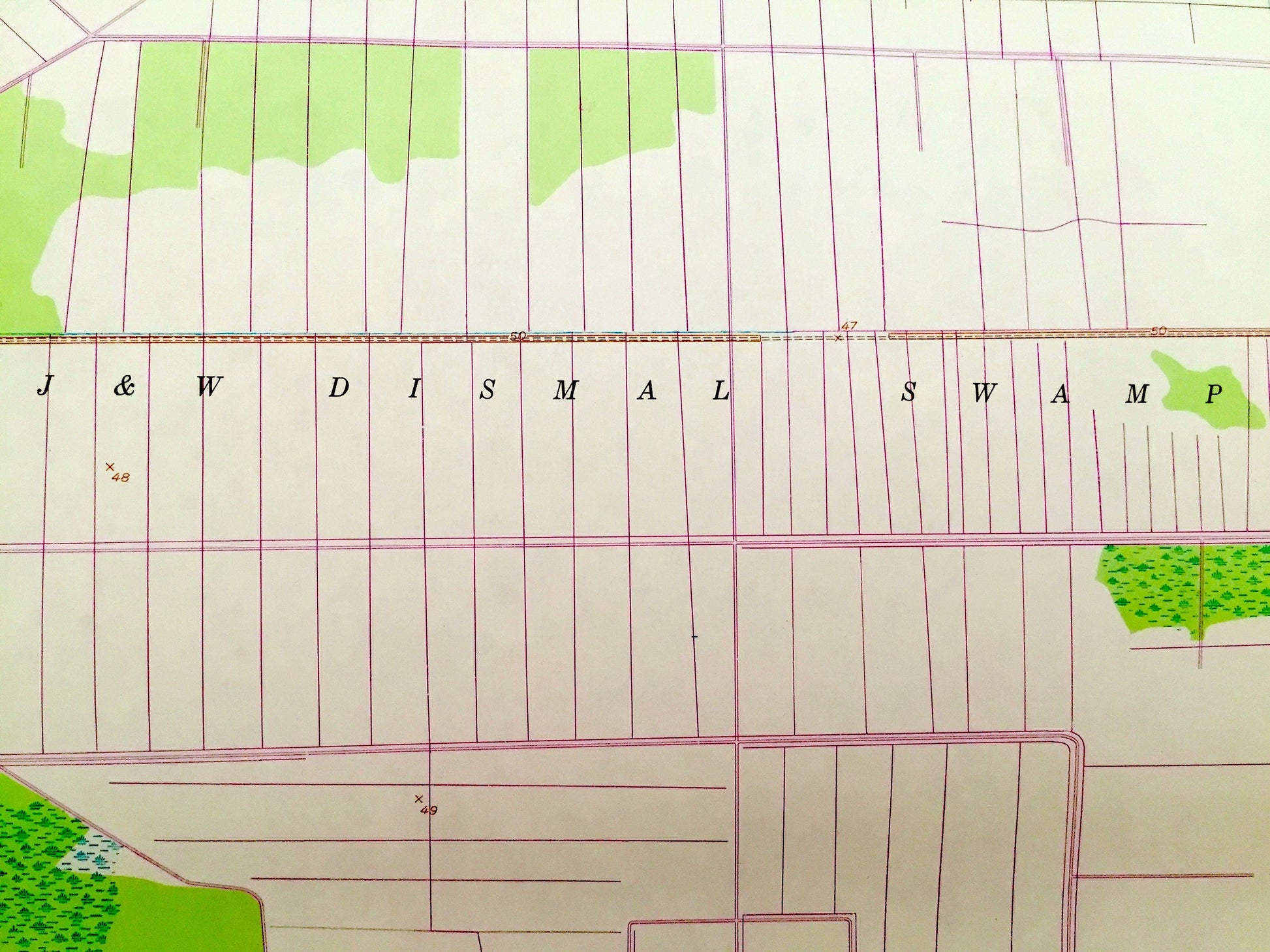 Points of Interest: J&W Dismal Swamp, Rosemary Church, Asbury Church, River Road School, Broad Creek, Woodwards Pond Church, Norfolk Southern Railroad, and many more roads, rivers, houses and churches.