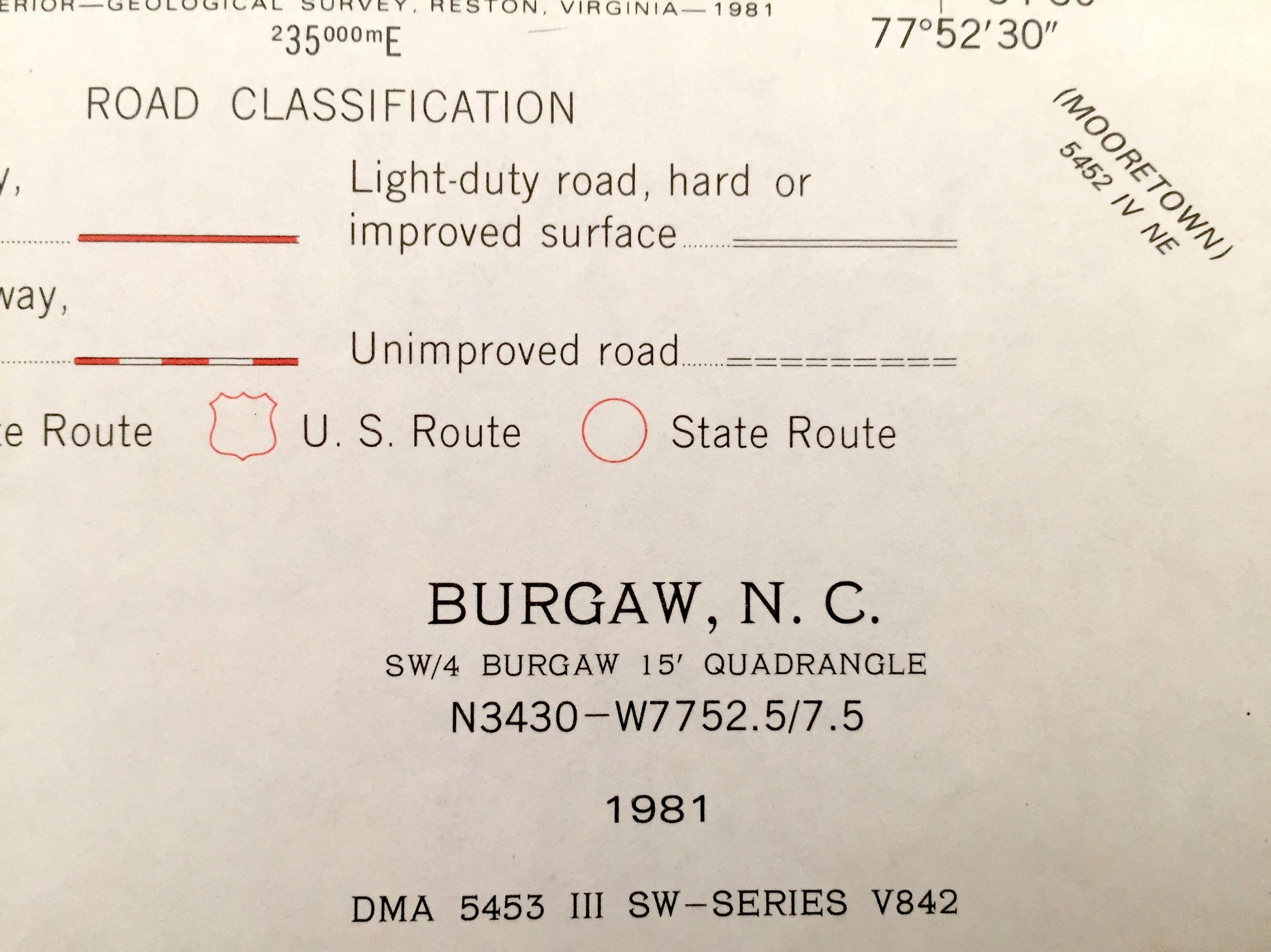 Beautiful, antique map of Burgaw, Murray Town, Van Eden, and St Helena, North Carolina. This is an authentic 1981 print from the U.S. Geological Survey and NOT a computer reproduction.