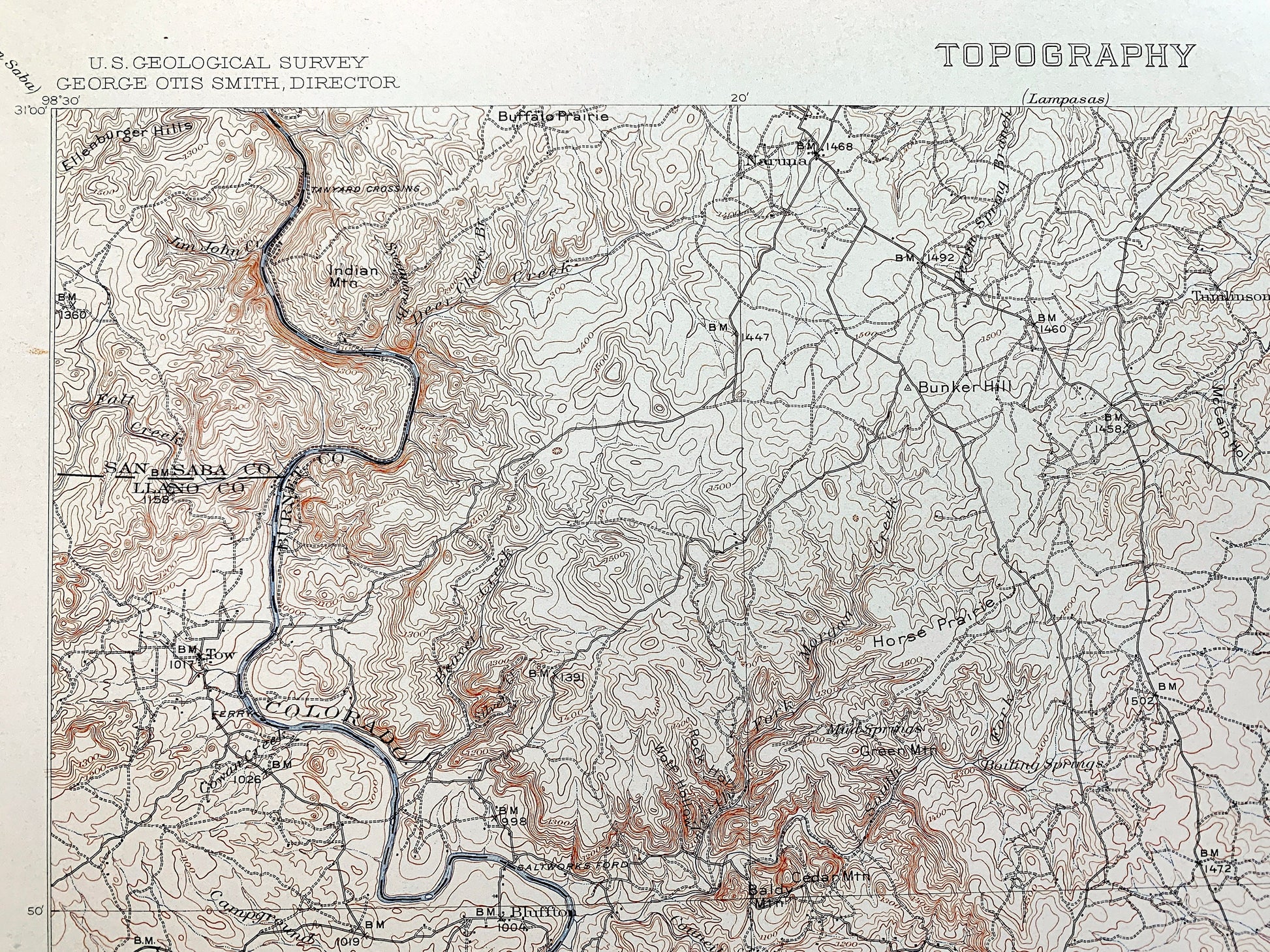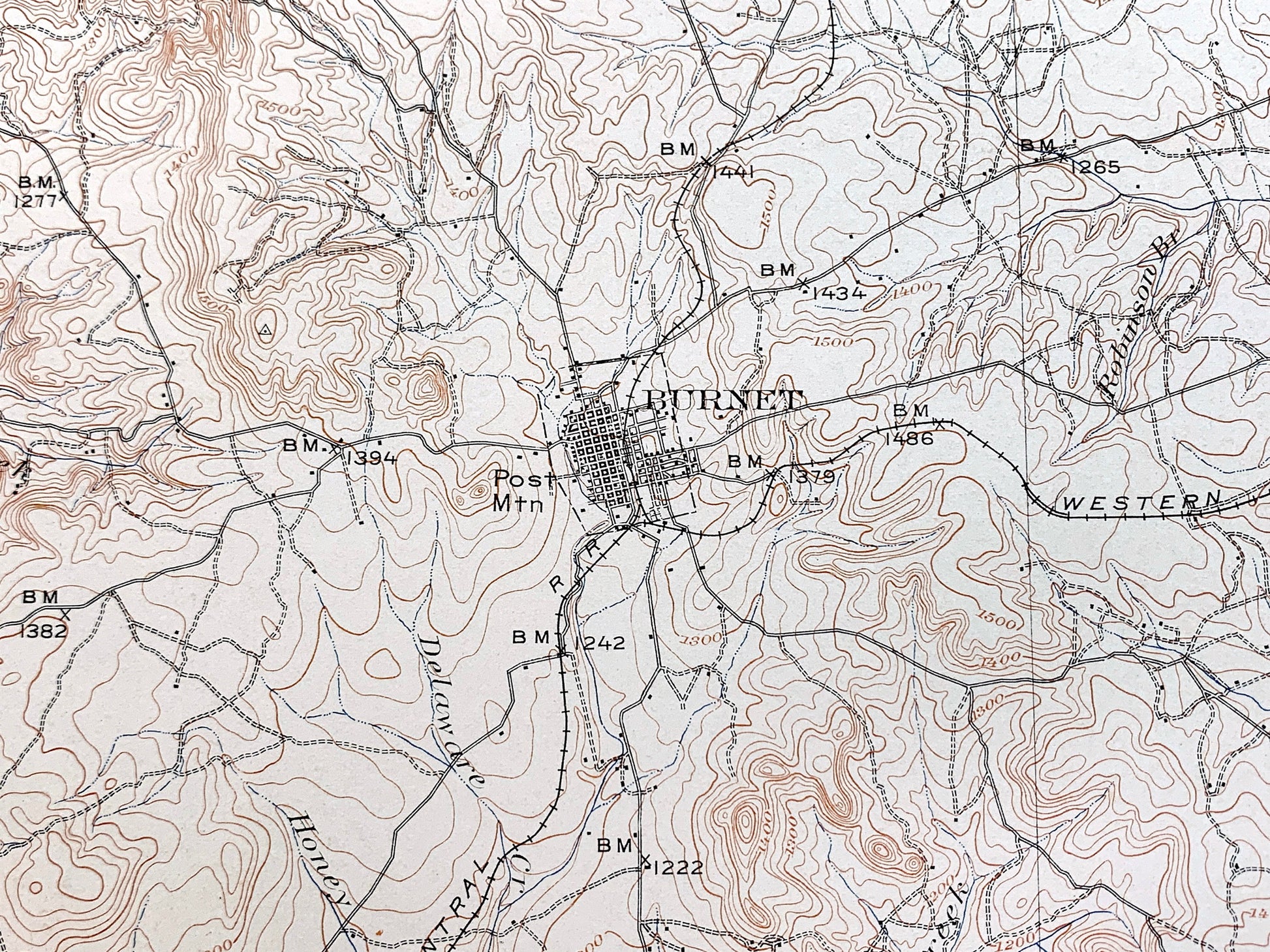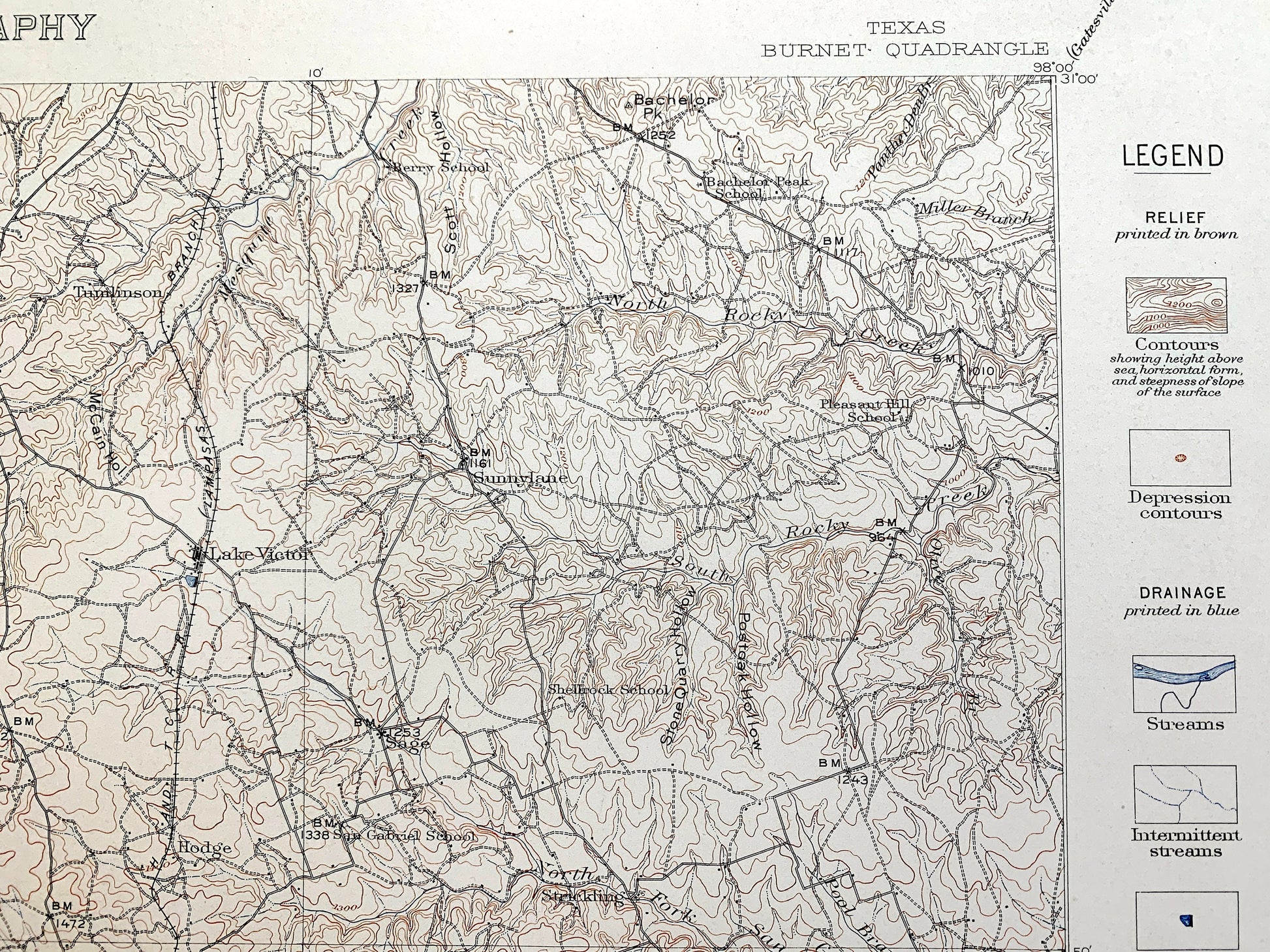 Beautiful, antique map of Burnet, Texas and surrounding Burnet County area. This is an authentic 1909 edition, 1911 print from the U.S. Geological Survey and NOT a computer reproduction. It is from a Geologic Atlas folio.