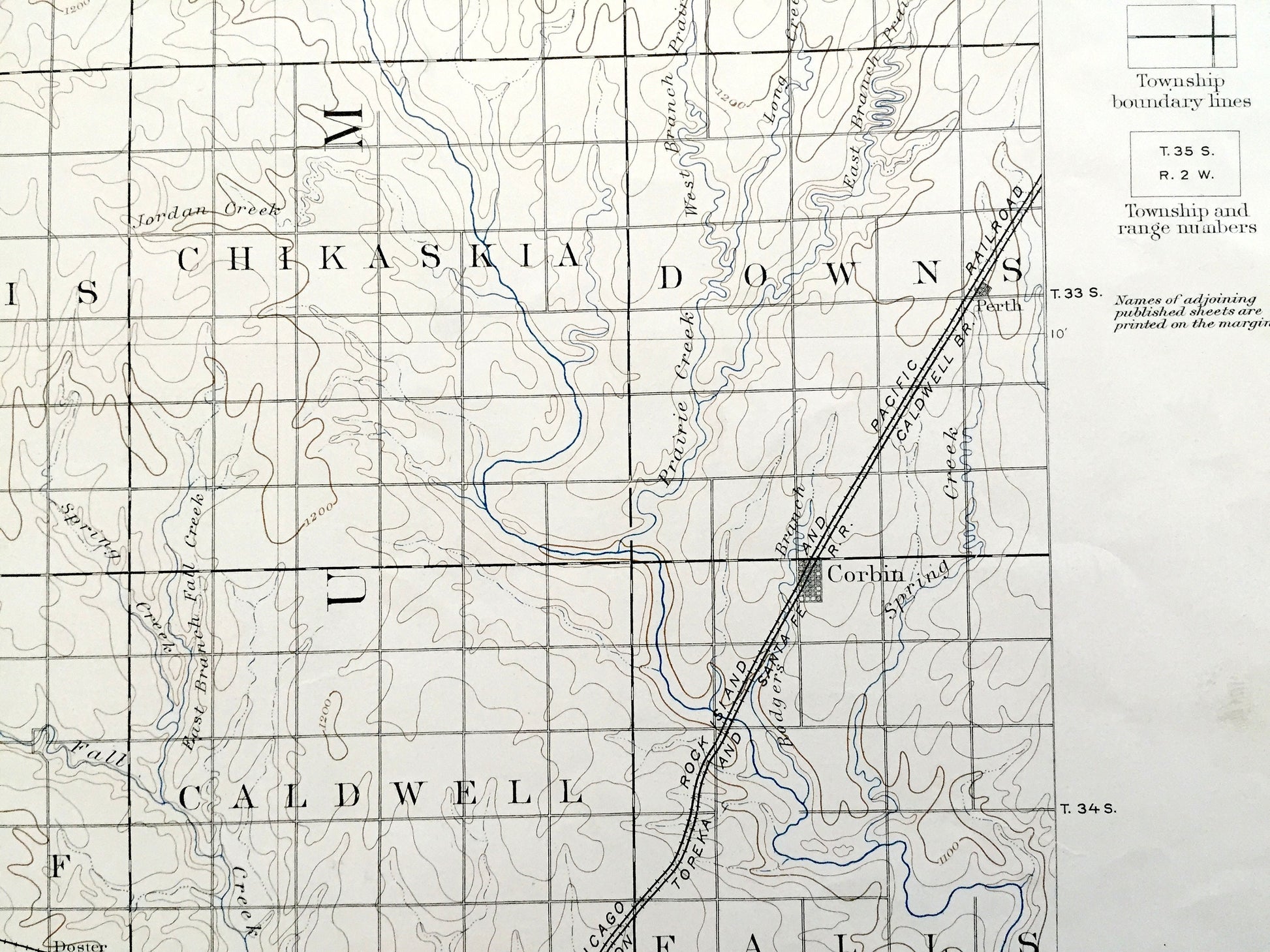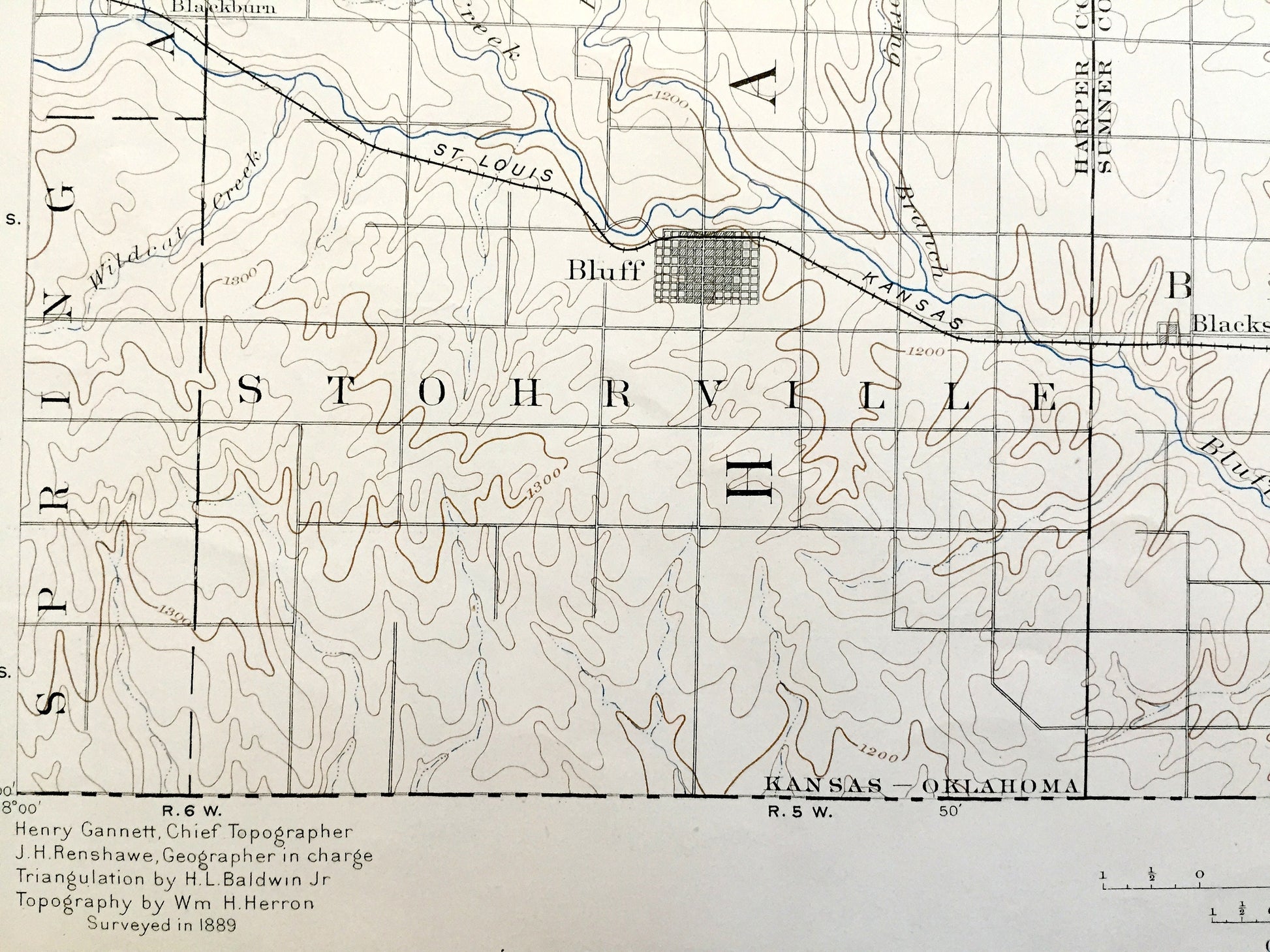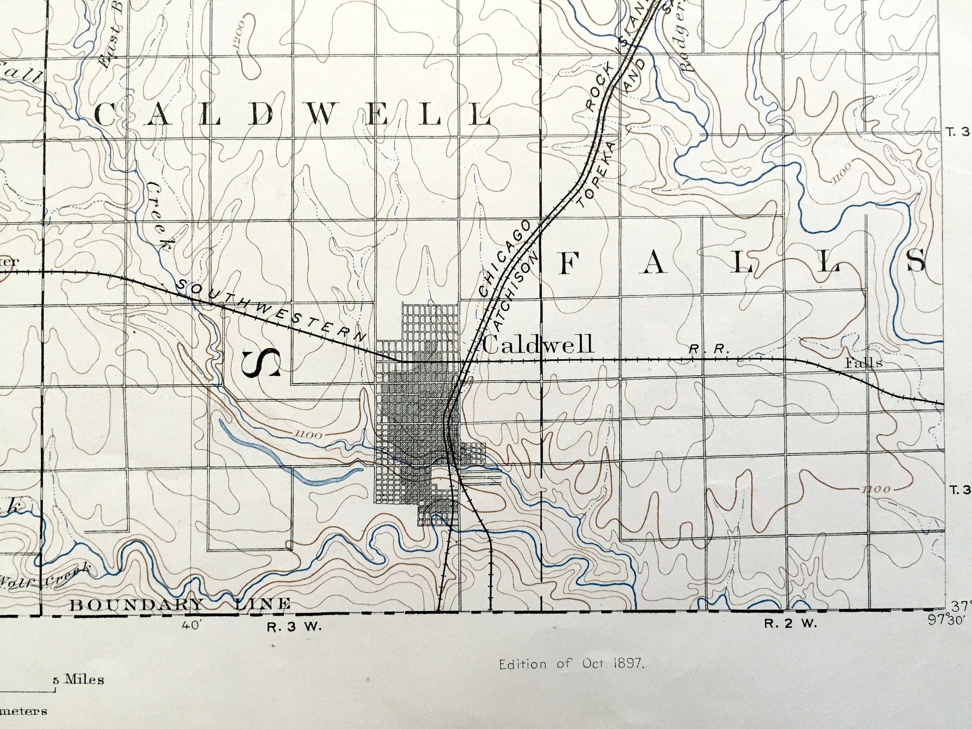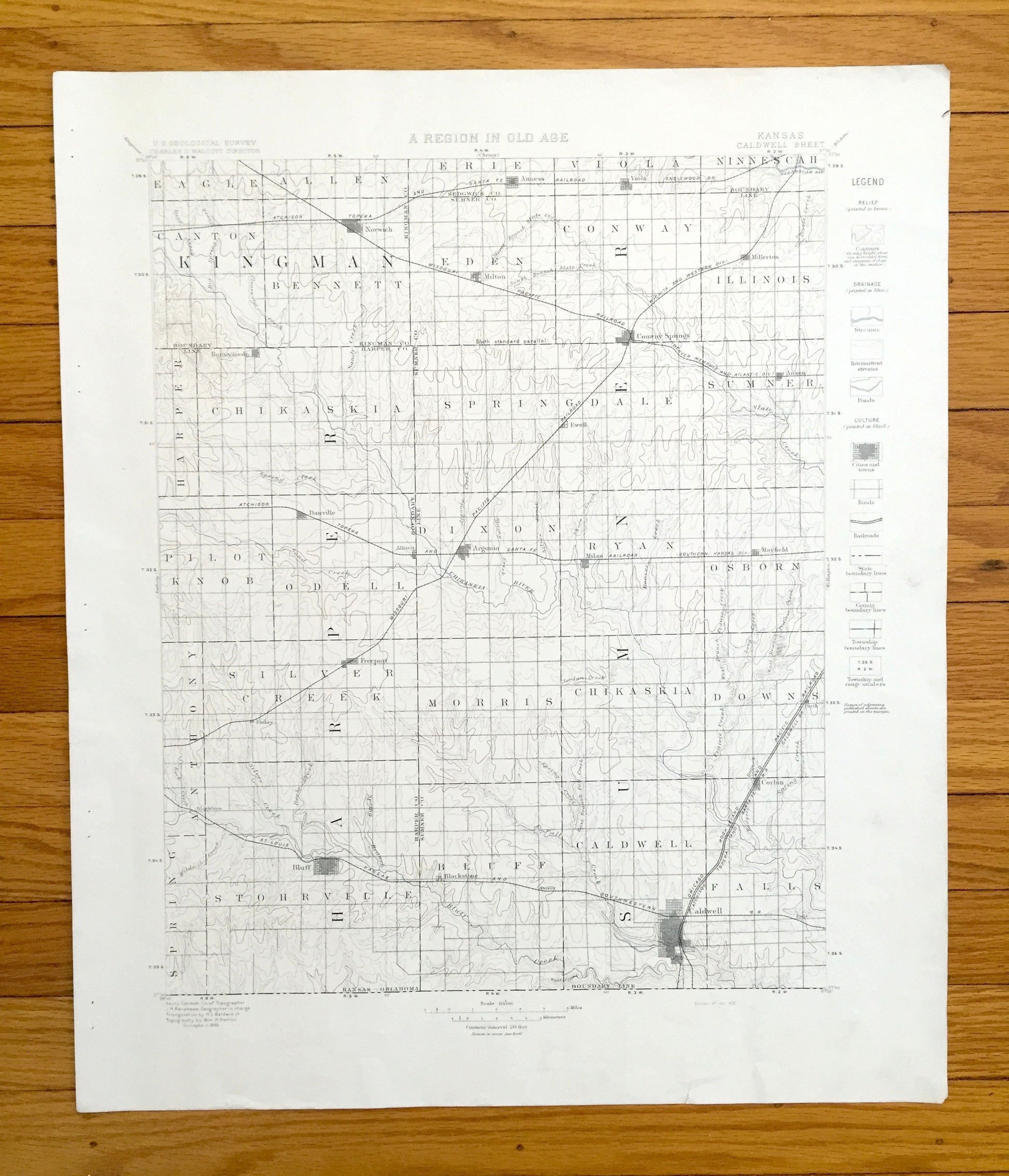 Beautiful, antique map of Caldwell, Kansas and surrounding Sumner, Harper, Kingman, and Sedgwick County areas. This is an authentic 1889 edition, 1889 print from the U.S. Geological Survey and NOT a computer reproduction. It is from a Geologic Atlas folio and has the unique and rare heading of "A Region in Old Age."