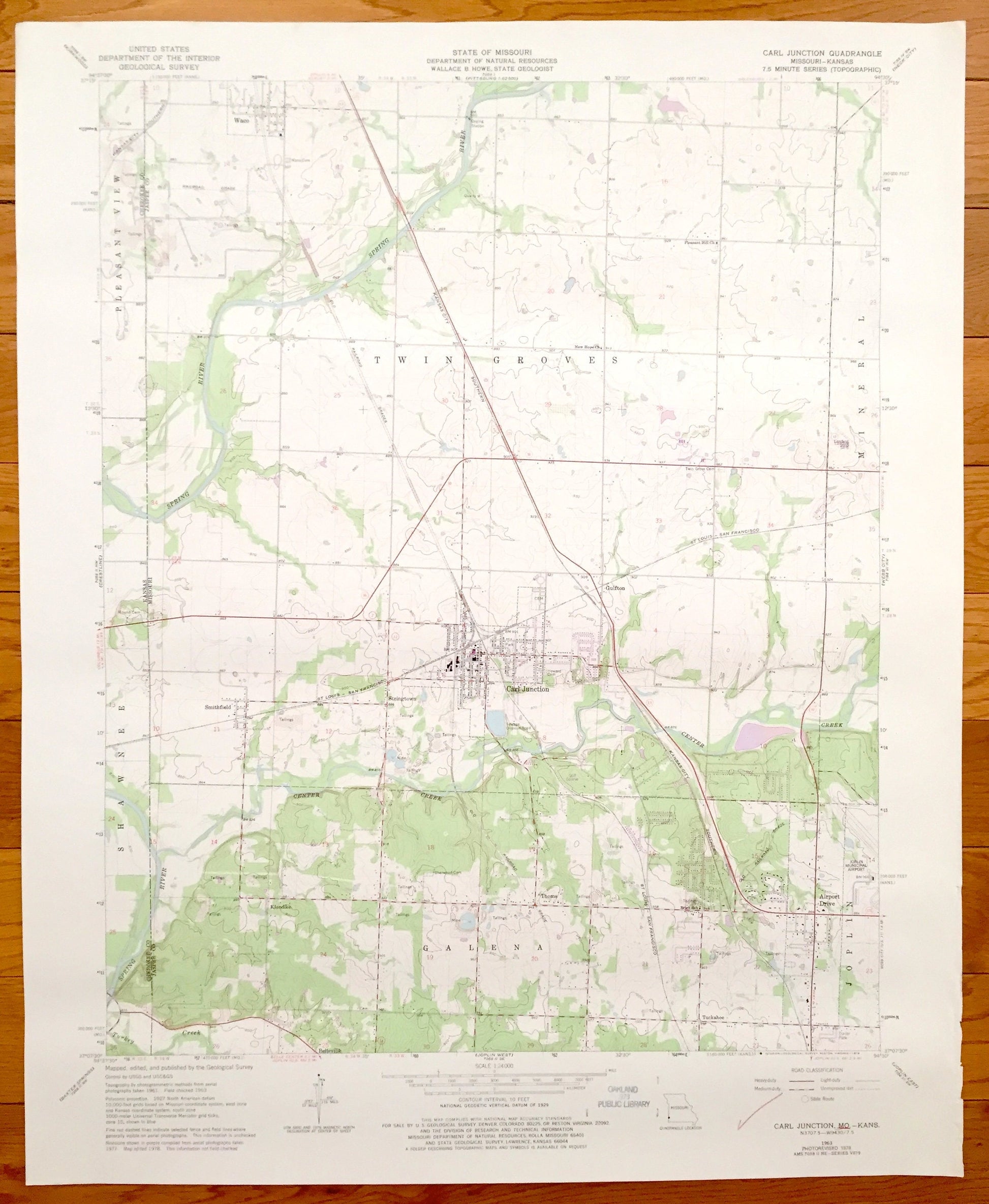 Beautiful, antique map of Galena, Joplin, Carl Junction, Twin Groves, Missouri, including Shawnee & Pleasant View, Kansas. This is an authentic 1978 of print of 1963 survey data from the U.S. Geological Survey and NOT a computer reproduction.