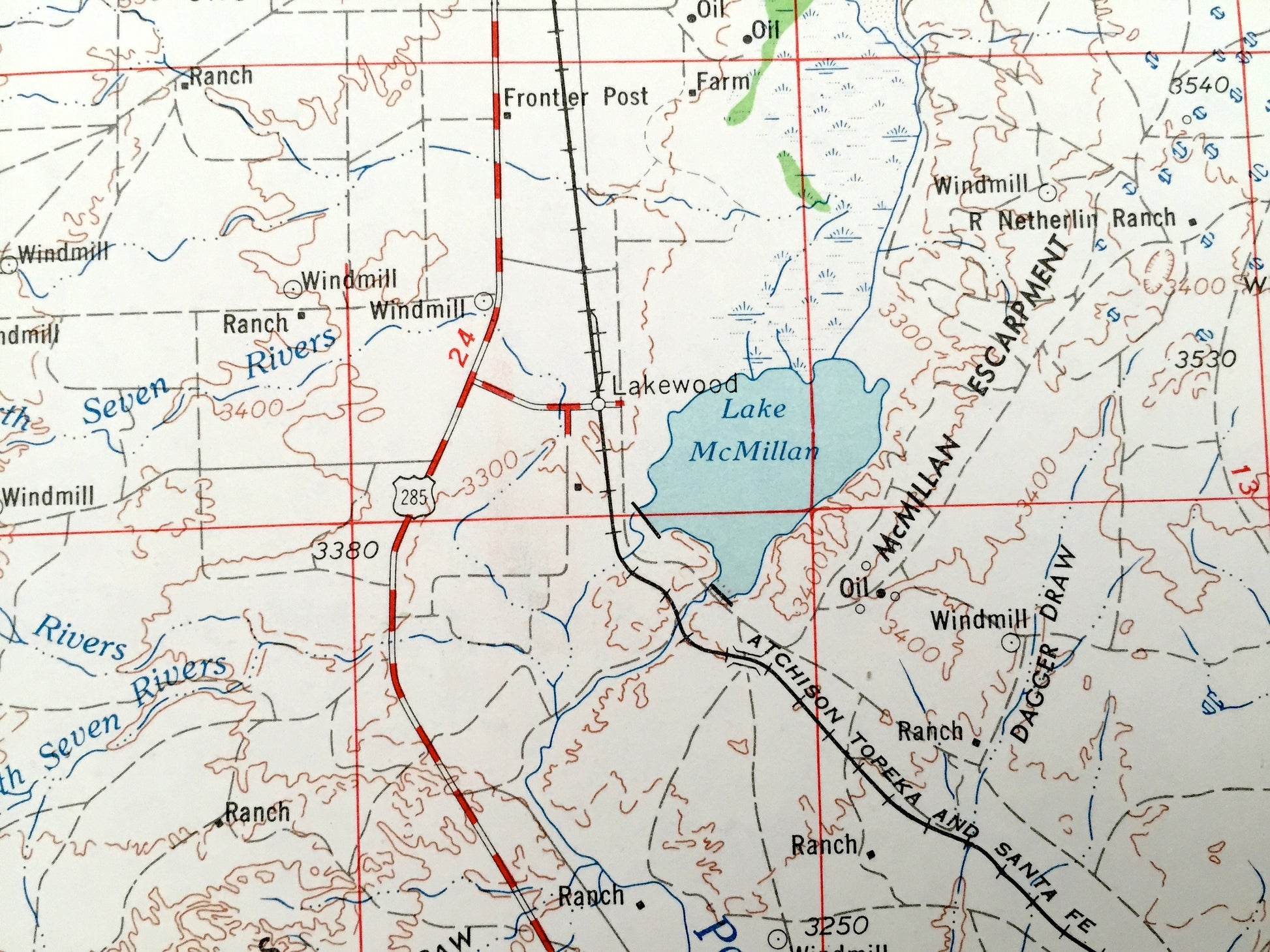 Points of Interest: NEW MEXICO - Tularosa Valley, Lincoln National Forest, Sacramento Mountains, Brokeoff Mountains, Guadalupe Mountain, Seven Rivers Hills, Azotea Mesa, Dark Canyon, Black river, Pecos River, Carlsbad Caverns National Park, Lake McMillan, Alkali Lake and lots more hills, mountains, rivers, lakes, creeks, roads, highways and railroads.