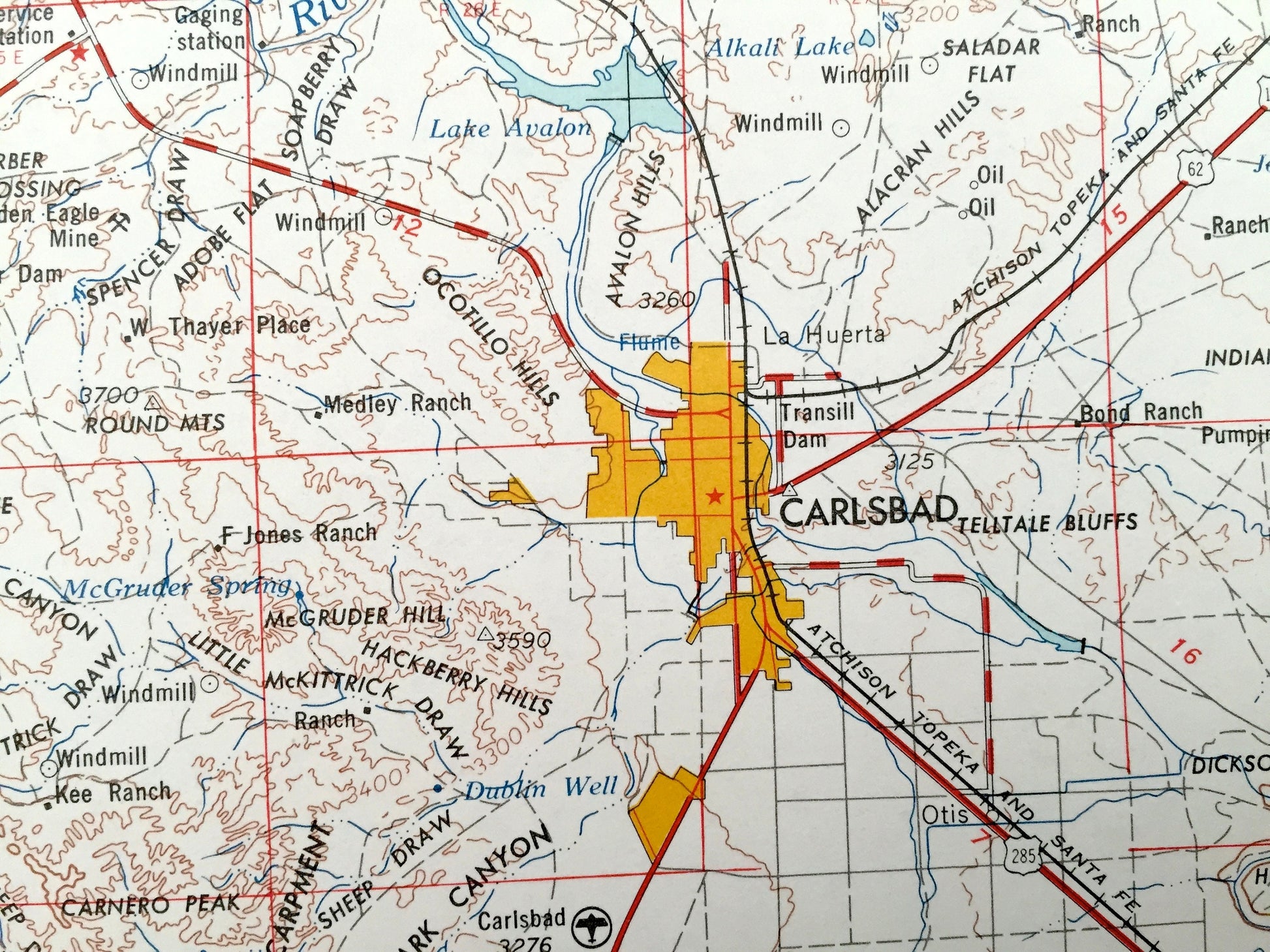 Beautiful, antique map of Carlsbad, New Mexico and surrounding Texas areas. This is an authentic 1954 edition, 1963 print from the U.S. Geological Survey and NOT a computer reproduction.