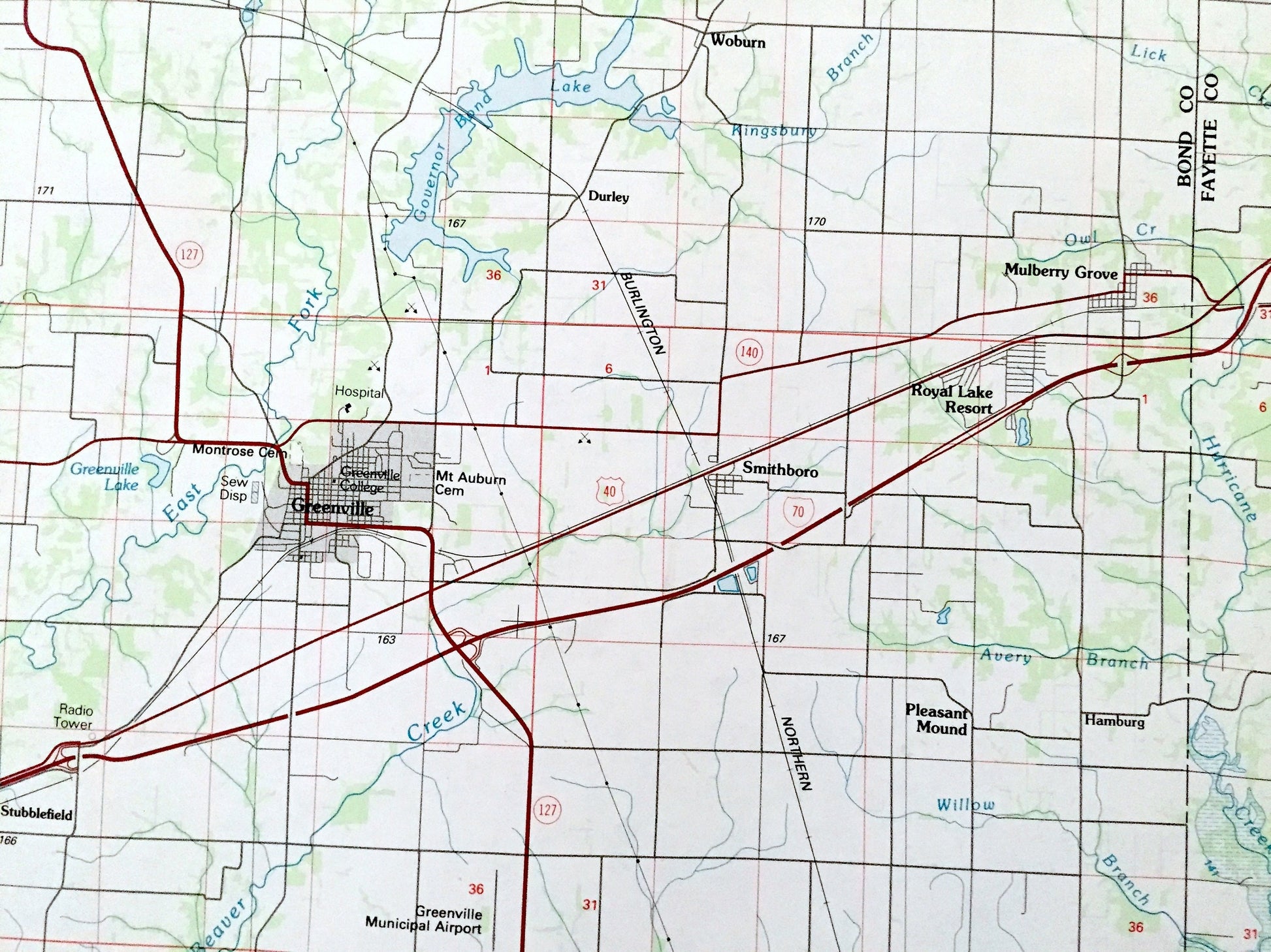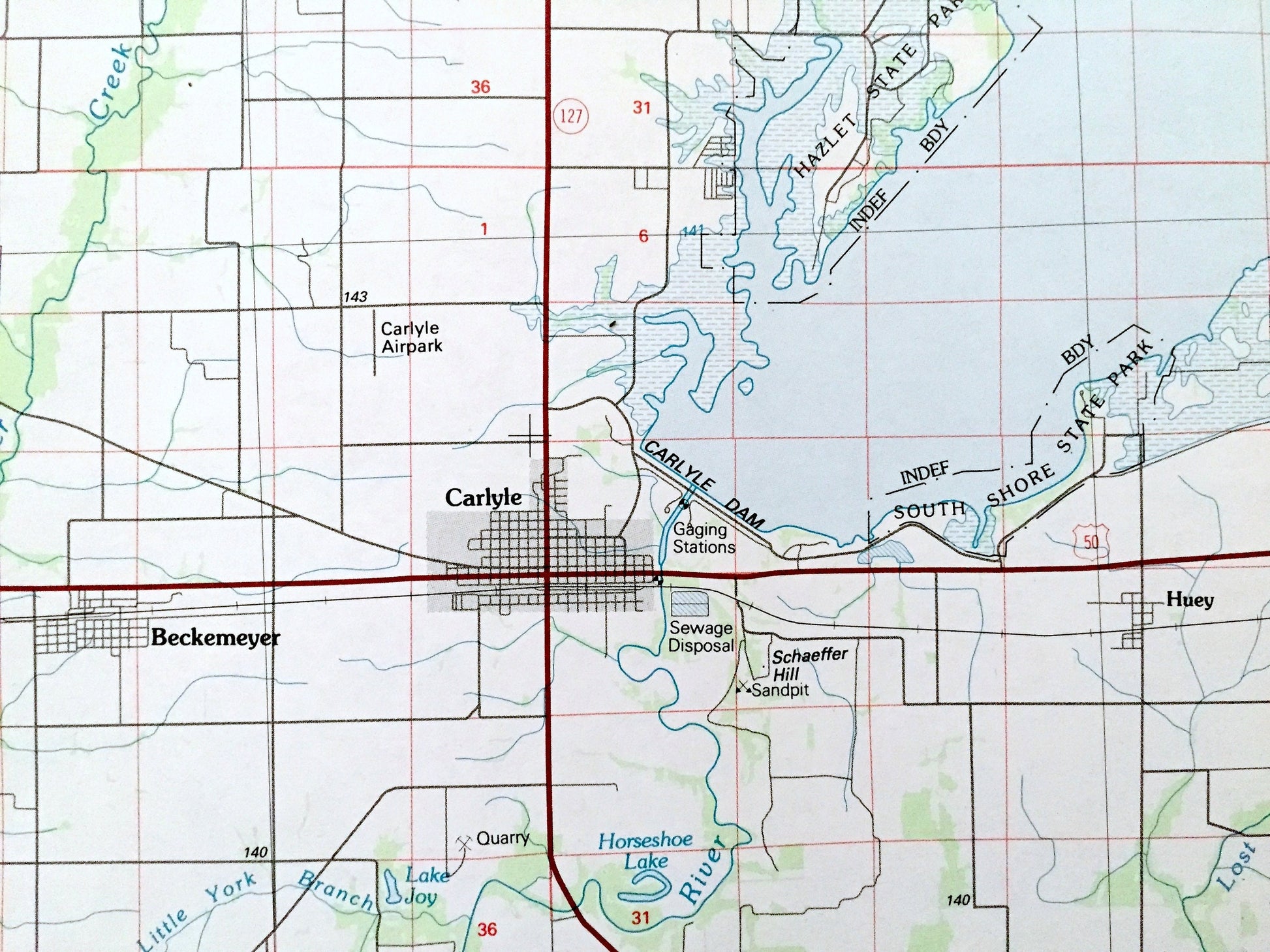 Points of Interest: Madison County, St Clair County, Clinton County, Bond County, Fayette County, Marion County, Carlyle Lake, Carlyle Lake State Wildlife Management Area, Hazlet State Park, South Shore State Park, Carlyle Dam, Centralia Reservoir, Highland Silver Lake, Governor Bend Lake, Holiday Lake, Scott Air Force Base, and lots more hills, mountains, rivers, lakes, creeks, roads, highways and railroads.