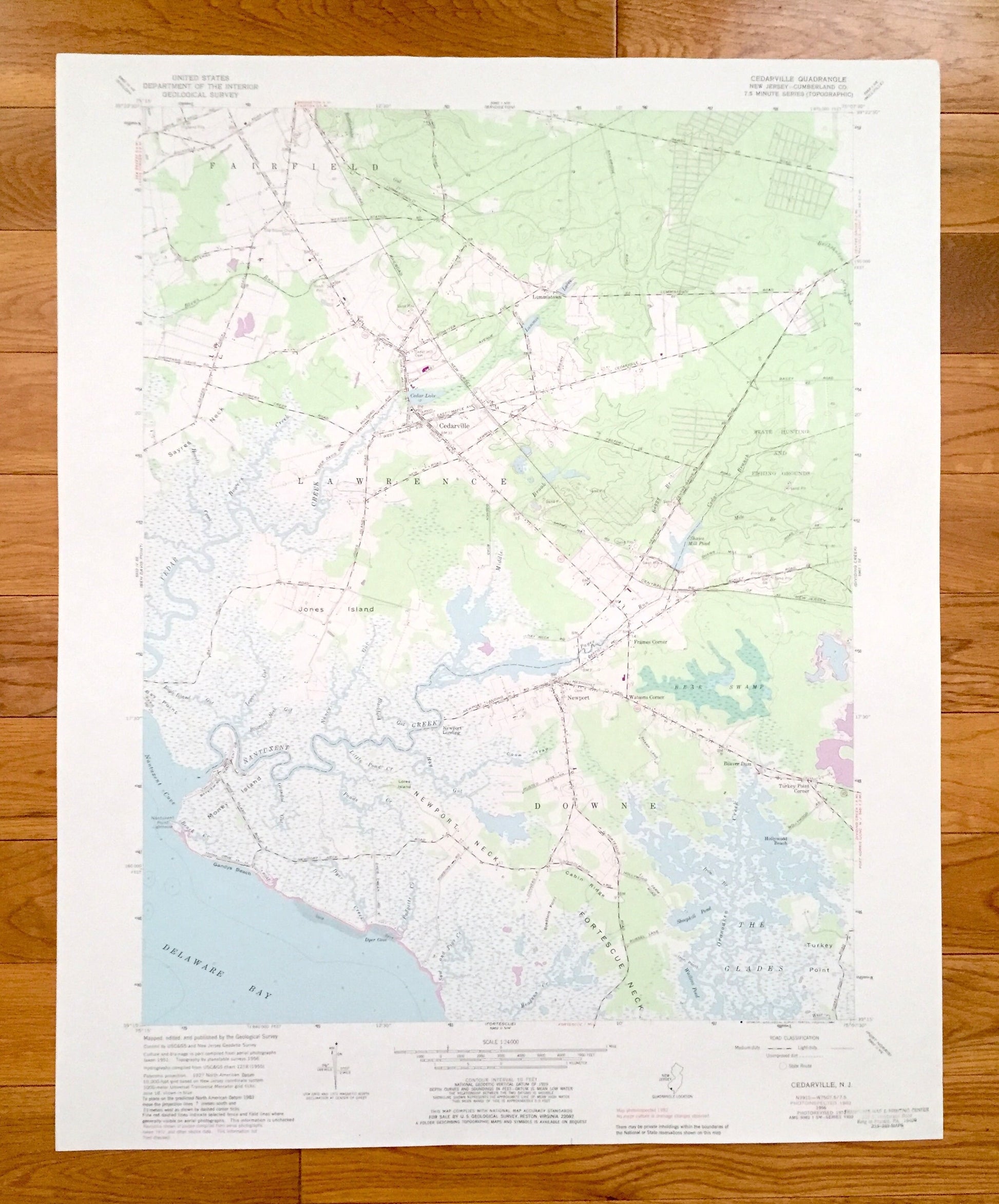Beautiful, antique map of Cedarville, New Jersey and surrounding Cumberland County areas. This is an authentic 1956 edition, 1984 print from the U.S. Geological Survey and NOT a computer reproduction.