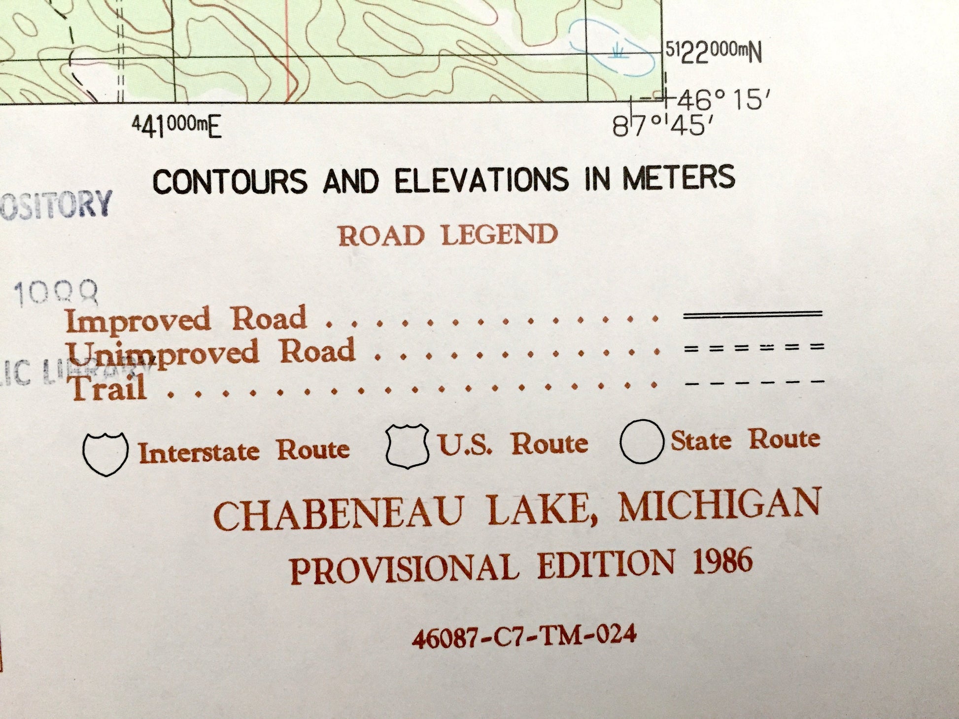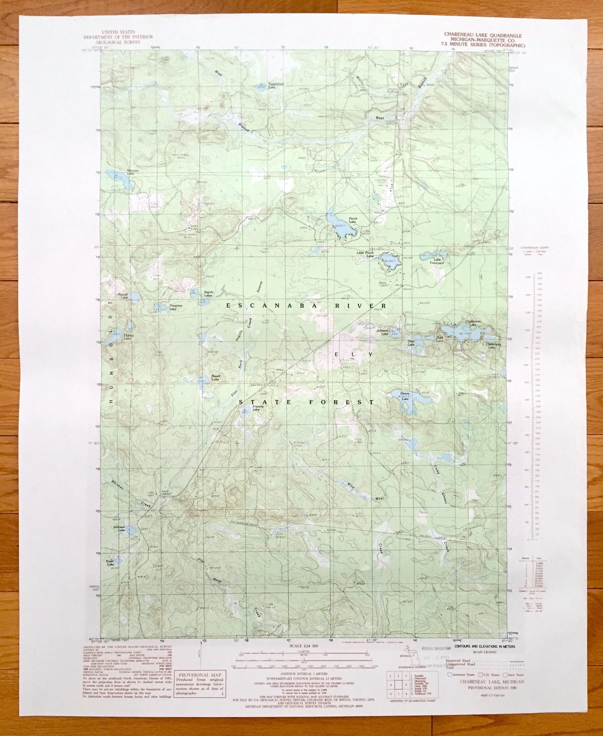 Beautiful, antique map of Chabeneau Lake in Escanaba River State Forest of Michigan. This is an authentic 1986 print from the U.S. Geological Survey and NOT a computer reproduction.