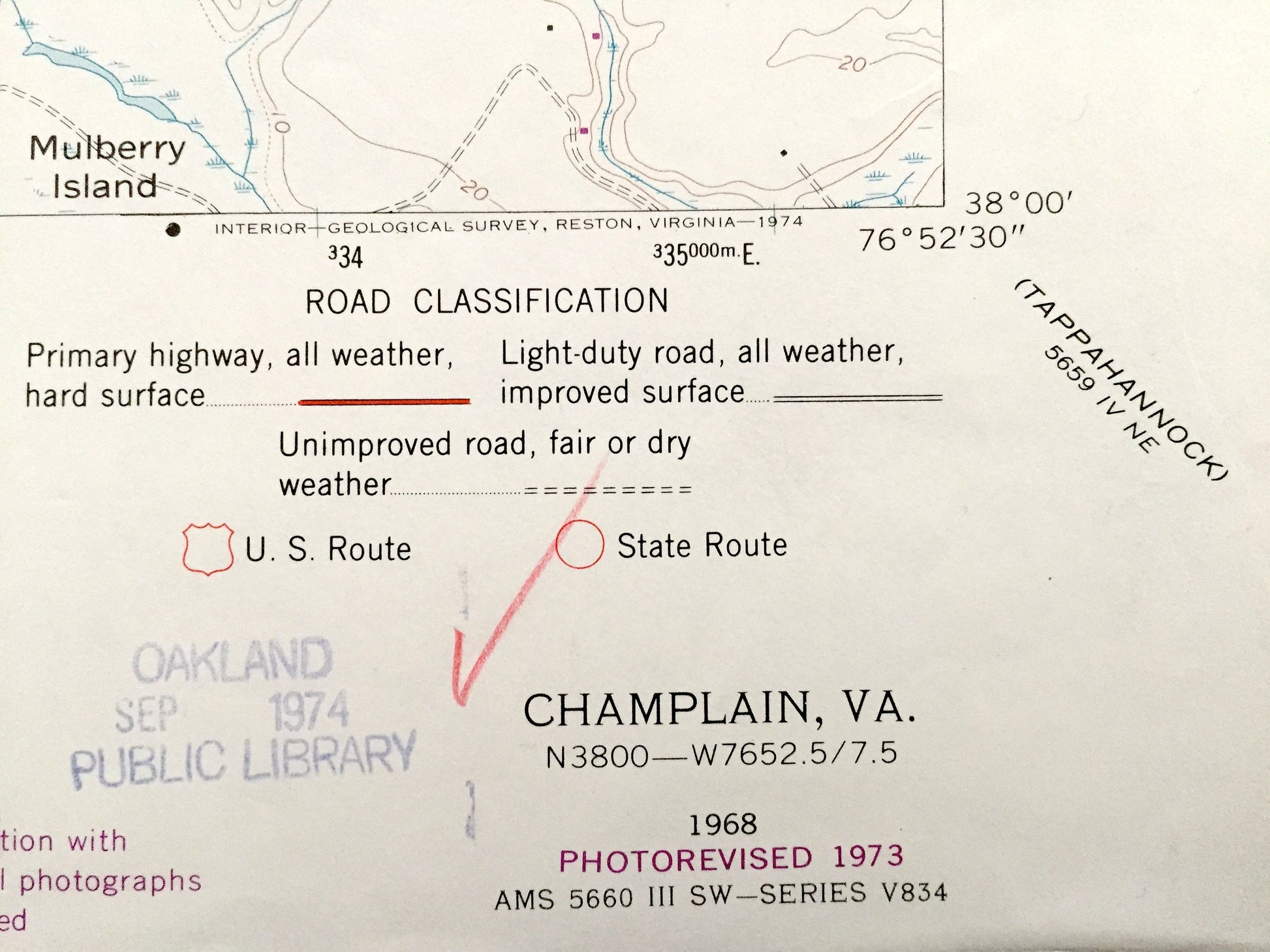 Beautiful, antique map of Champlain, Oak Row, Layton, Leedstown, Horners, and Foneswood, Virginia. This is an authentic 1968 edition, 1973 print from the U.S. Geological Survey and NOT a computer reproduction.