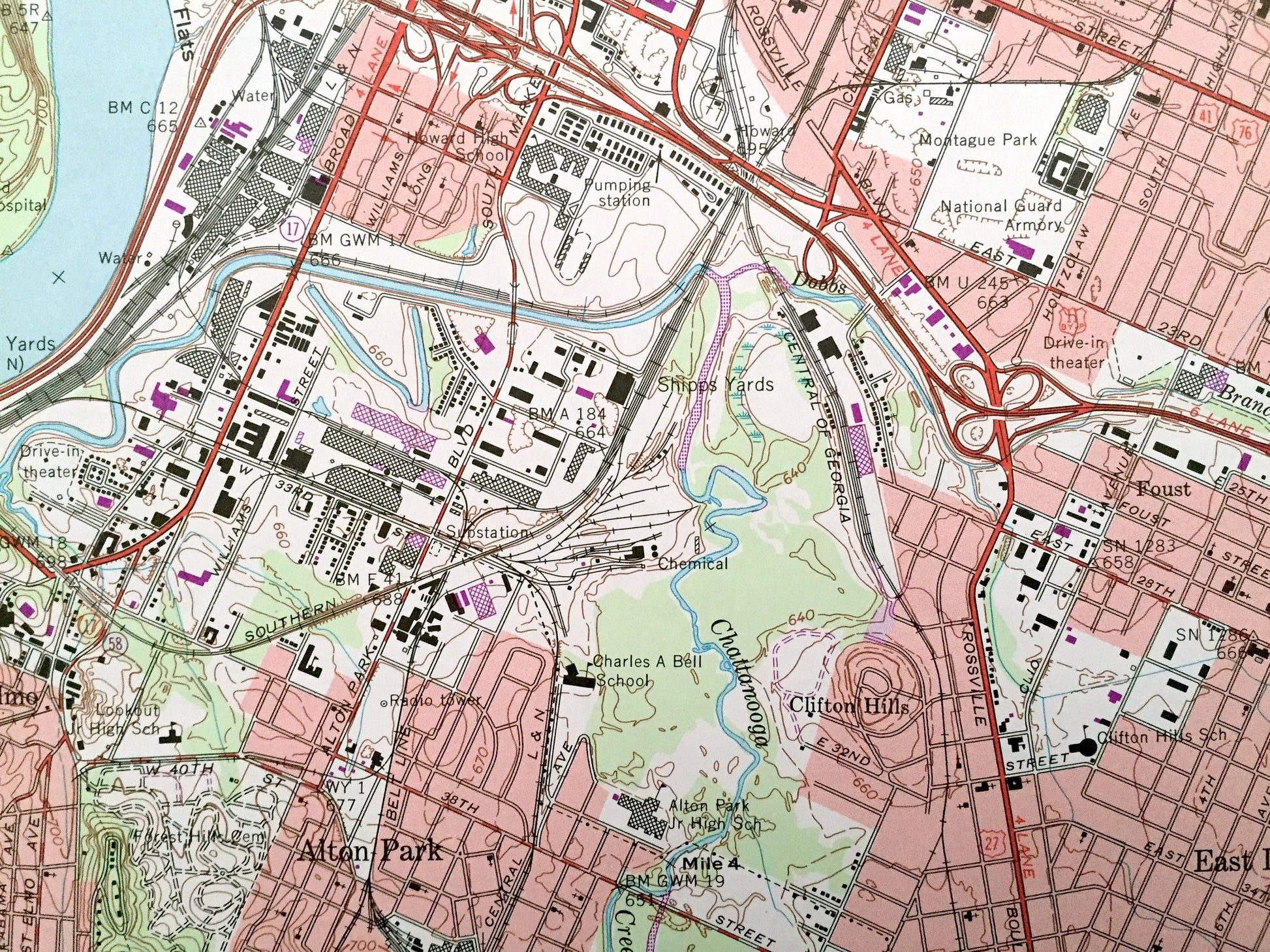Beautiful, antique map of Chattanooga, Tennessee and surrounding Hamilton and Marion County area. This is an authentic 1969 edition, 1976 print from the U.S. Geological Survey and NOT a computer reproduction.