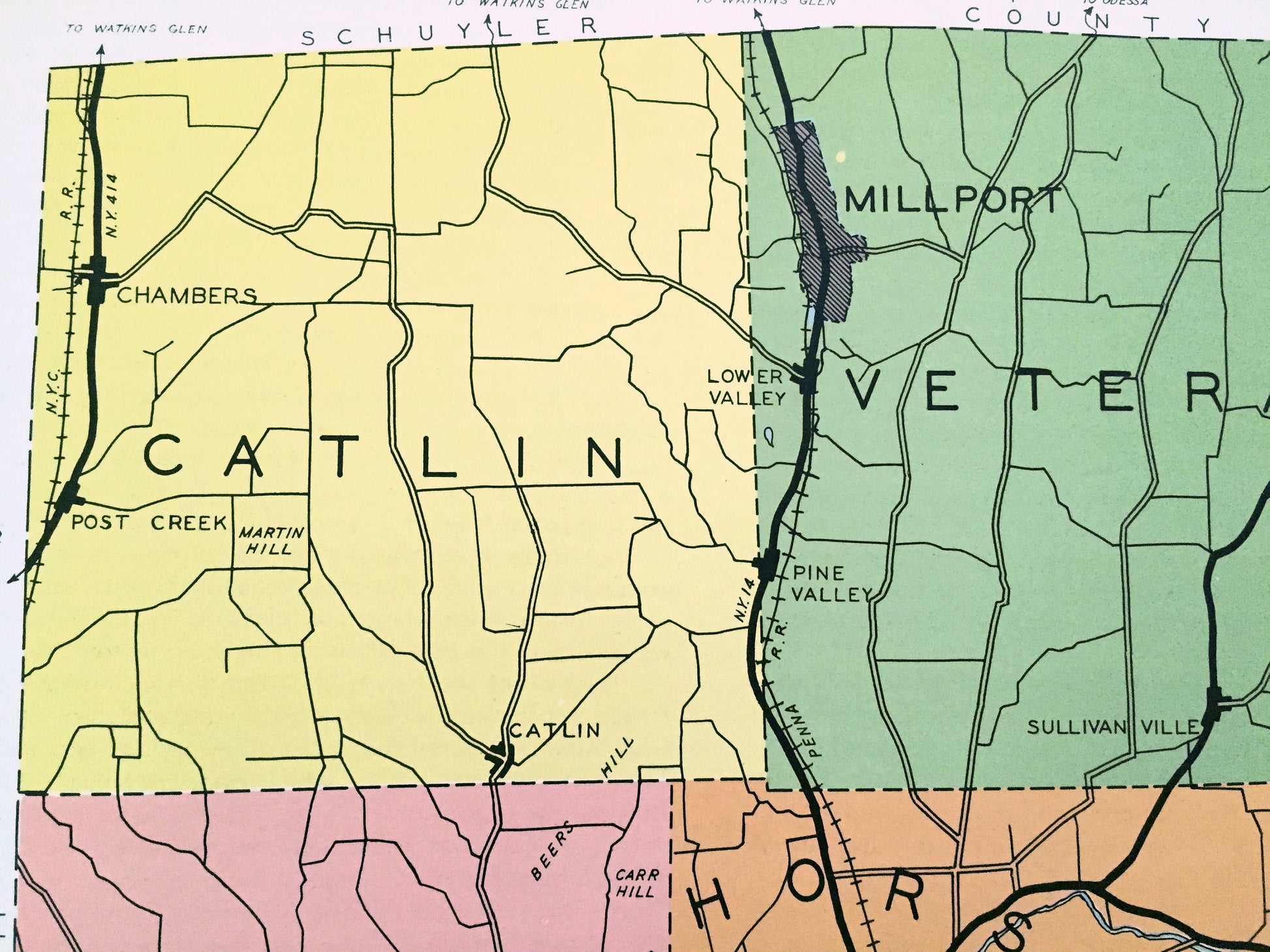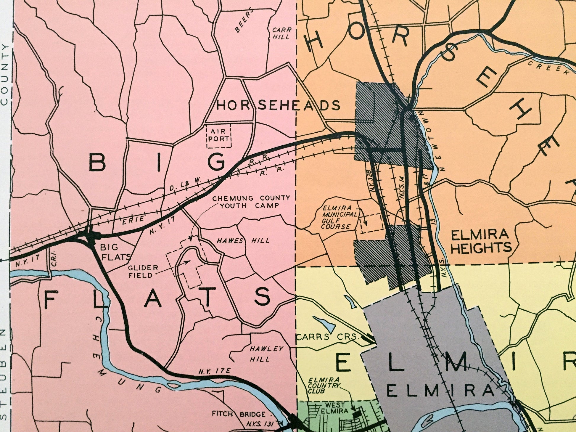 Antique Chemung County, New York 1941 Historical Atlas Map – Elmira, Horseheads, Big Flats, Breesport, Erin Wellsburg Southport Millport NY