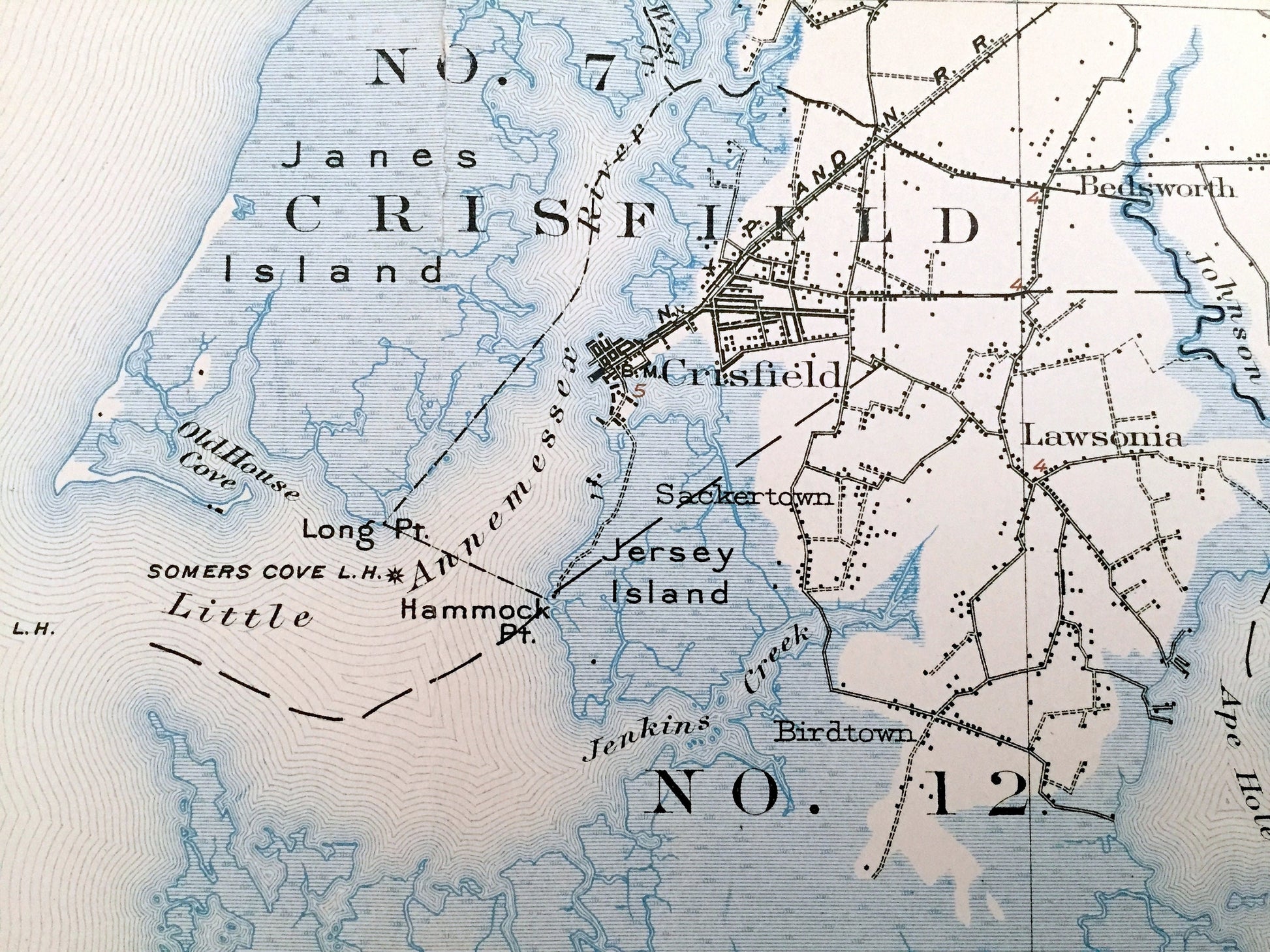 Points of Interest: Chesapeake Bay, Tangier Sound, Smith Island, Janes Island, Little Annemessex River, Jersey Island, Jenkins Creek, Ape Hole Creek, Johnson Creek, Fox Islands, Cedar Straits, Broad Creek, Great Fox Island, Does Hammock, Old House Cove, Somers Cove Lighthouse and many more small towns, roads, creeks, rivers, bays, islands, train tracks, schools, hills.
