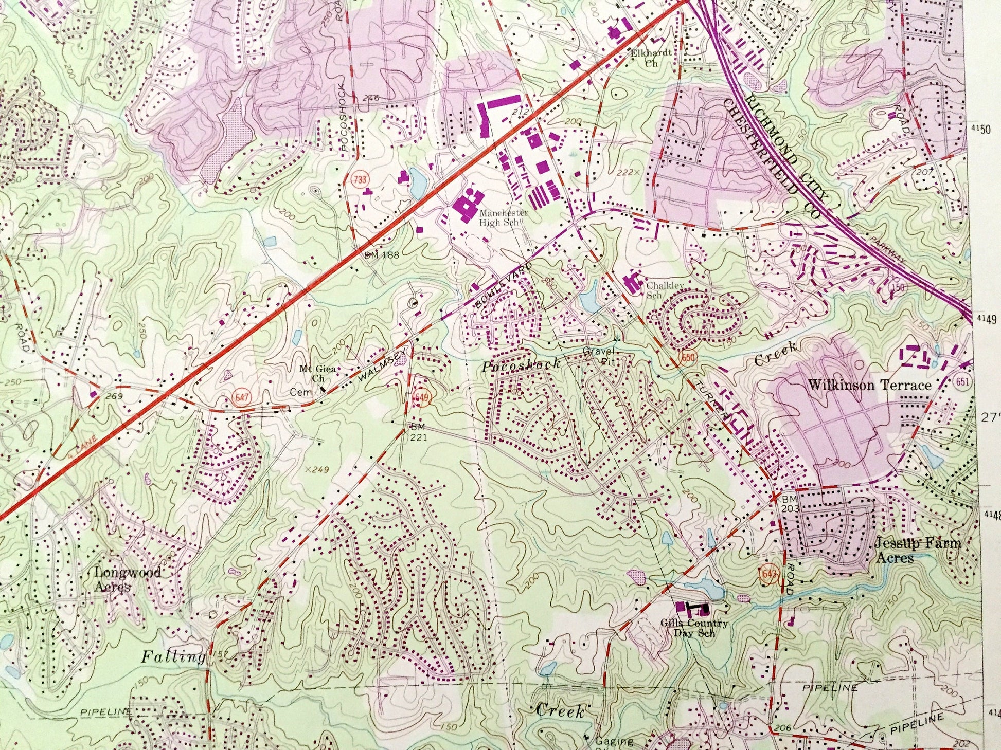 Beautiful, antique map of Chesterfield, Virginia and surrounding Chesterfield County area just west of Richmond. This is an authentic 1963 edition, 1987 print from the U.S. Geological Survey and NOT a computer reproduction.