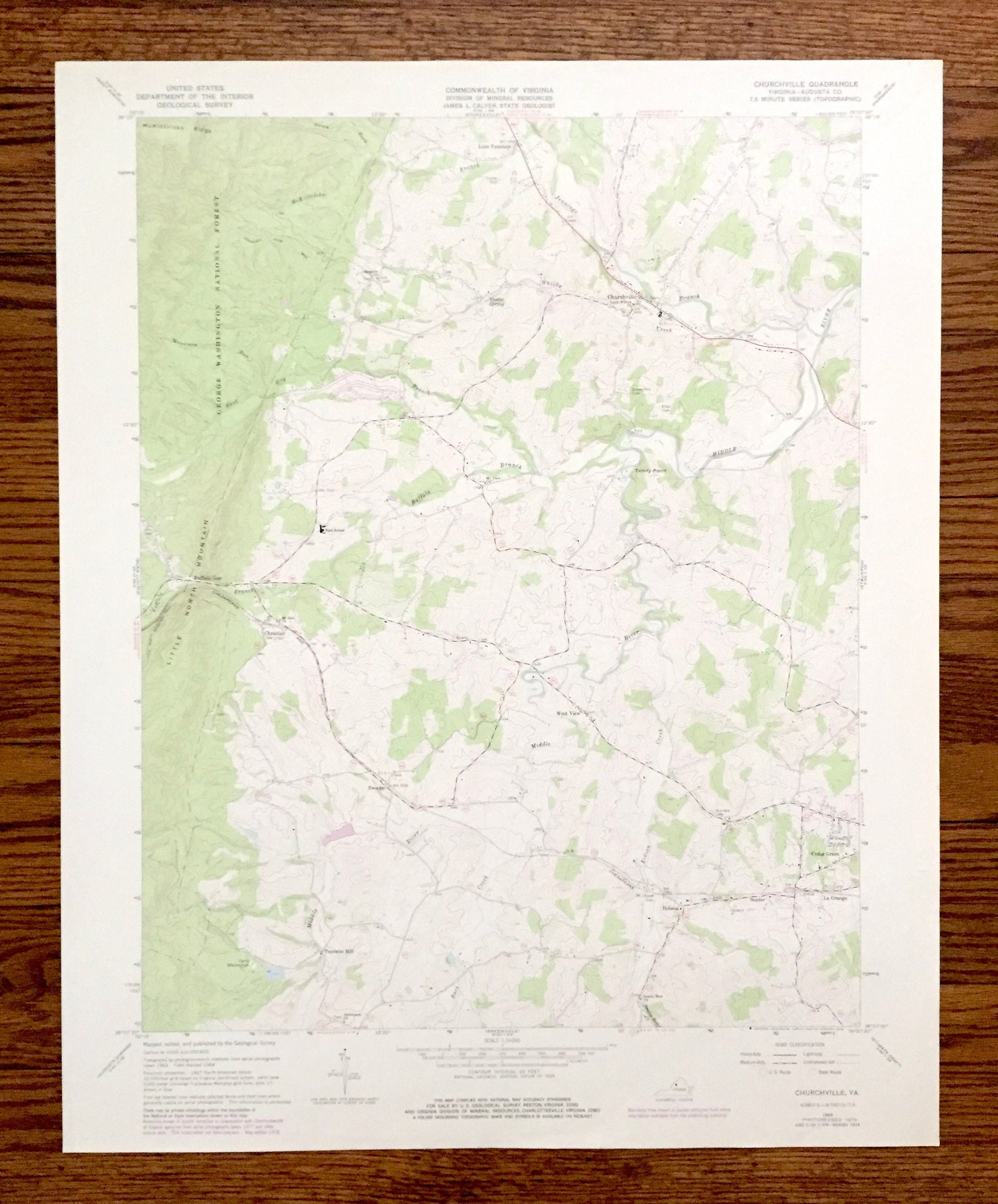 Beautiful, antique map of Churchville, Virginia and surrounding Augusta County area. This is an authentic 1964 edition, 1978 print from the U.S. Geological Survey and NOT a computer reproduction.