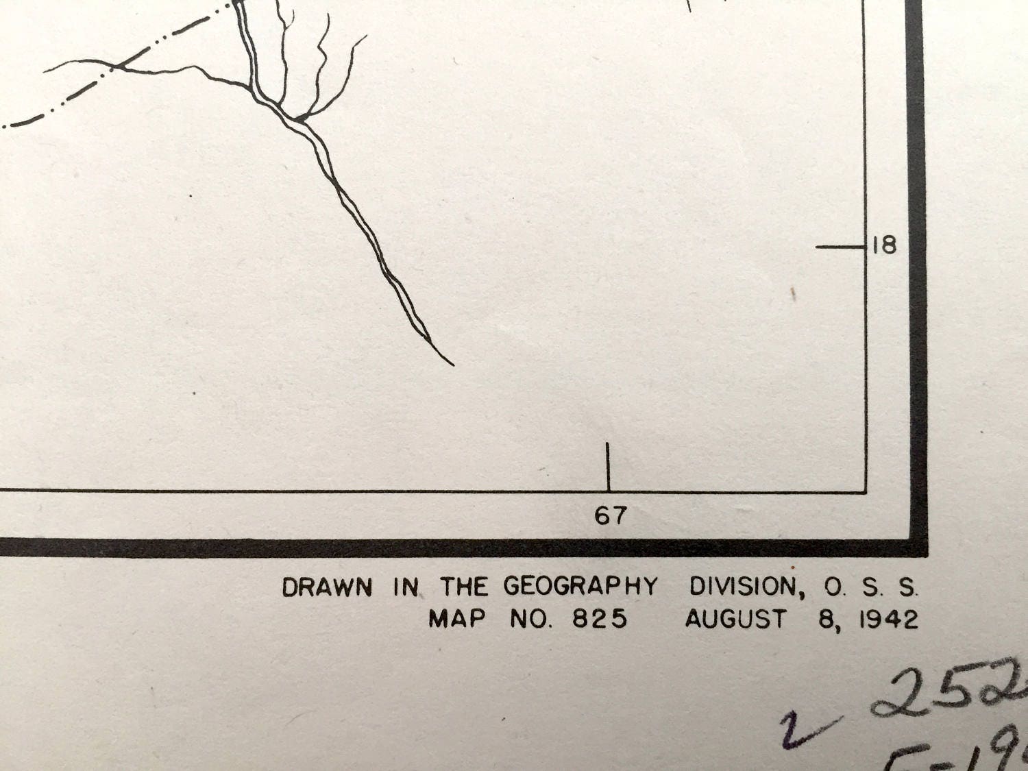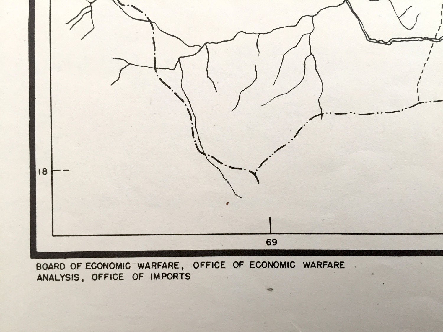 Beautiful, antique map of The Cinchona Region of Bolivia from 1942 for the US Board of Economic Warfare. This is a formerly restricted and confidential map from the US Government. The word "restricted" has been inked out, possibly when the info was declassified—but over time this ink has evaporated from the paper, revealing what is underneath. The paper is thick and has an american eagle watermark pattern.