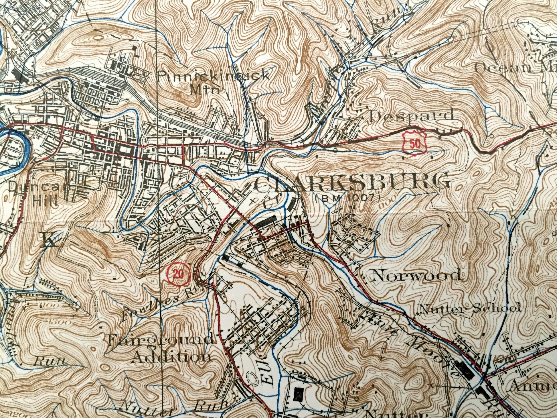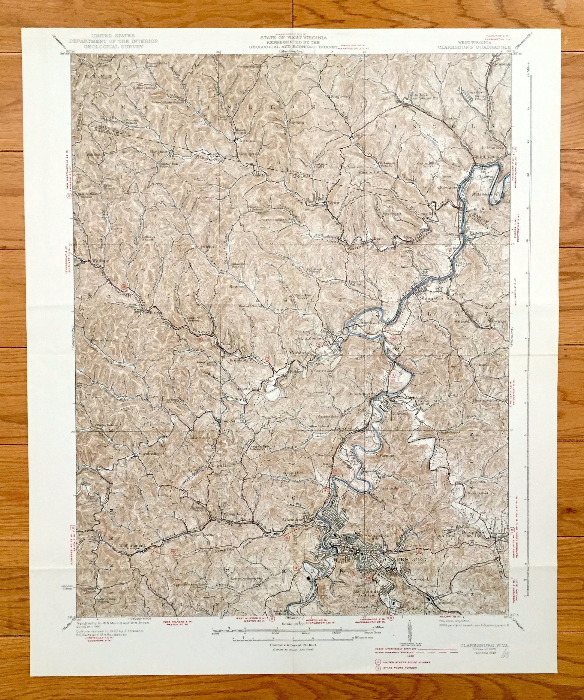 Beautiful, antique map of Clarksburg, West Virginia and surrounding Harrison, Wetzel, and Marion County area. This is an authentic 1925 edition, 1939 print from the U.S. Geological Survey and NOT a computer reproduction.