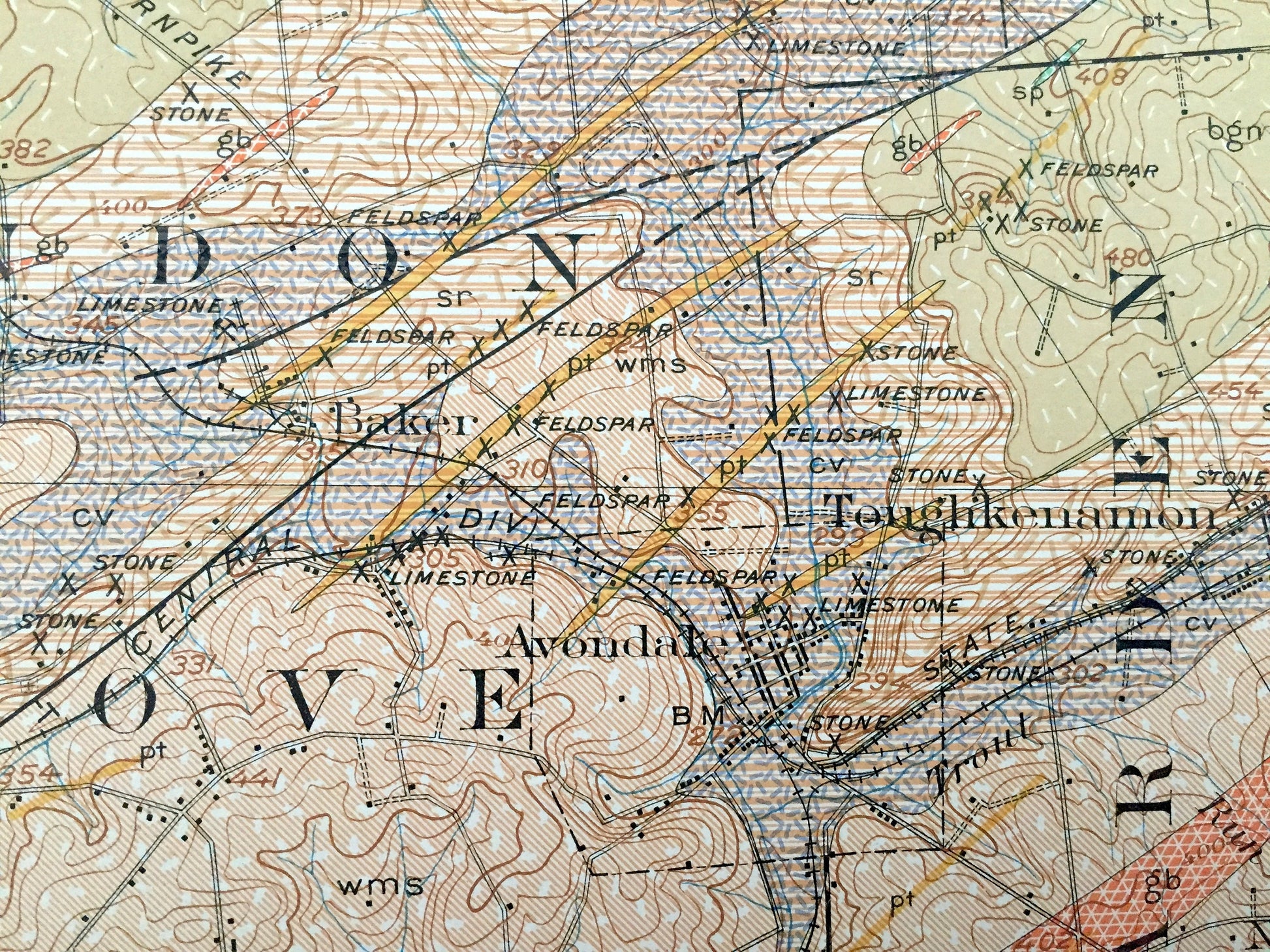 Beautiful, antique geological map of Coatesville, Oxford, Pomeroy, Parkesburg, Toughkenamon and surrounding Chester County area. This is an authentic 1931 print from the U.S. Geological Survey and NOT a computer reproduction. It is from a Geologic Atlas folio and is in very fine library condition.