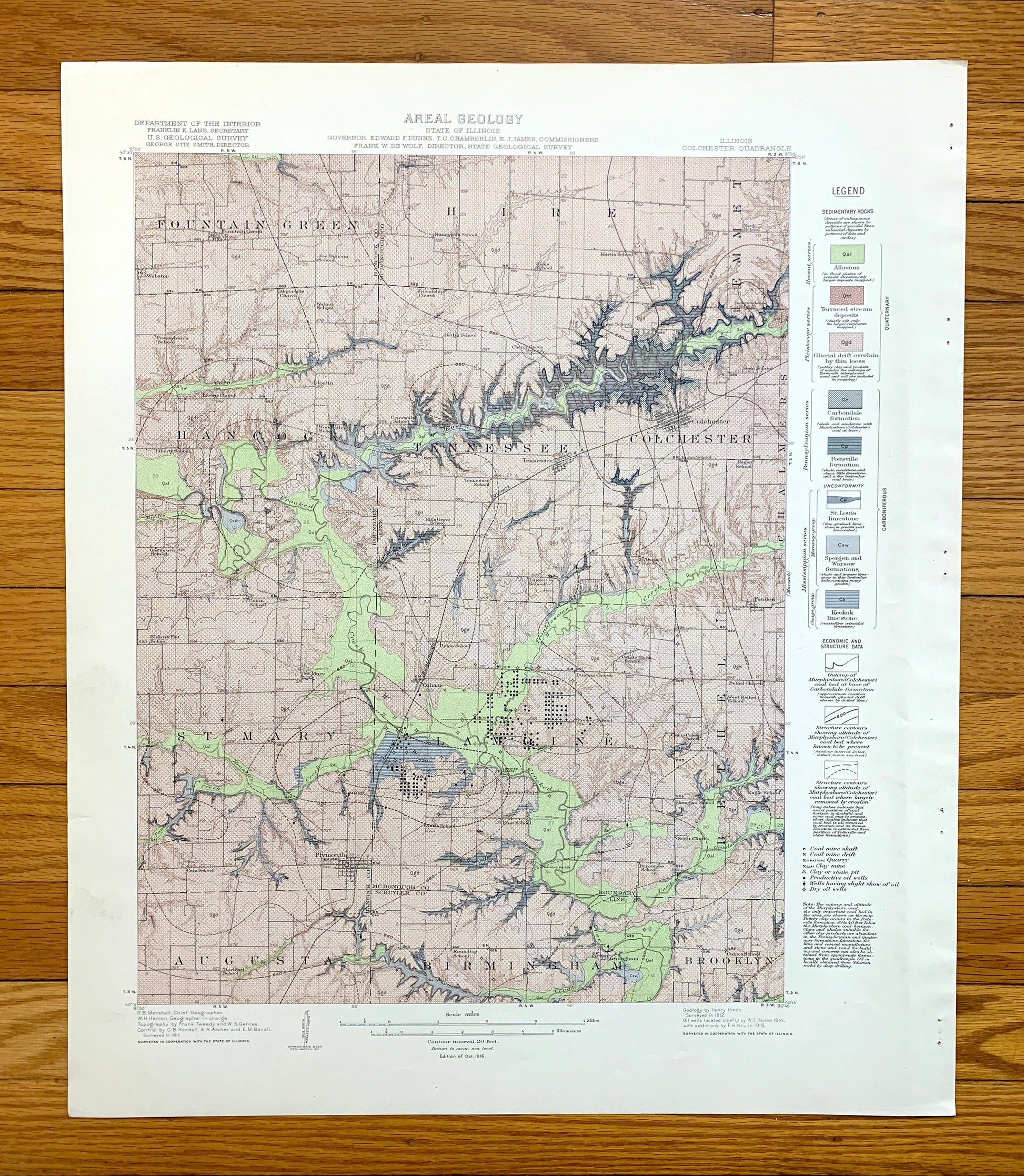 Beautiful, antique Areal Geology map of Colchester, Illinois and surrounding McDonough, Schuyler and Hancock County areas. This is an authentic 1916 edition, 1916 print from the U.S. Geological Survey and NOT a computer reproduction. It is from a Geologic Atlas folio.