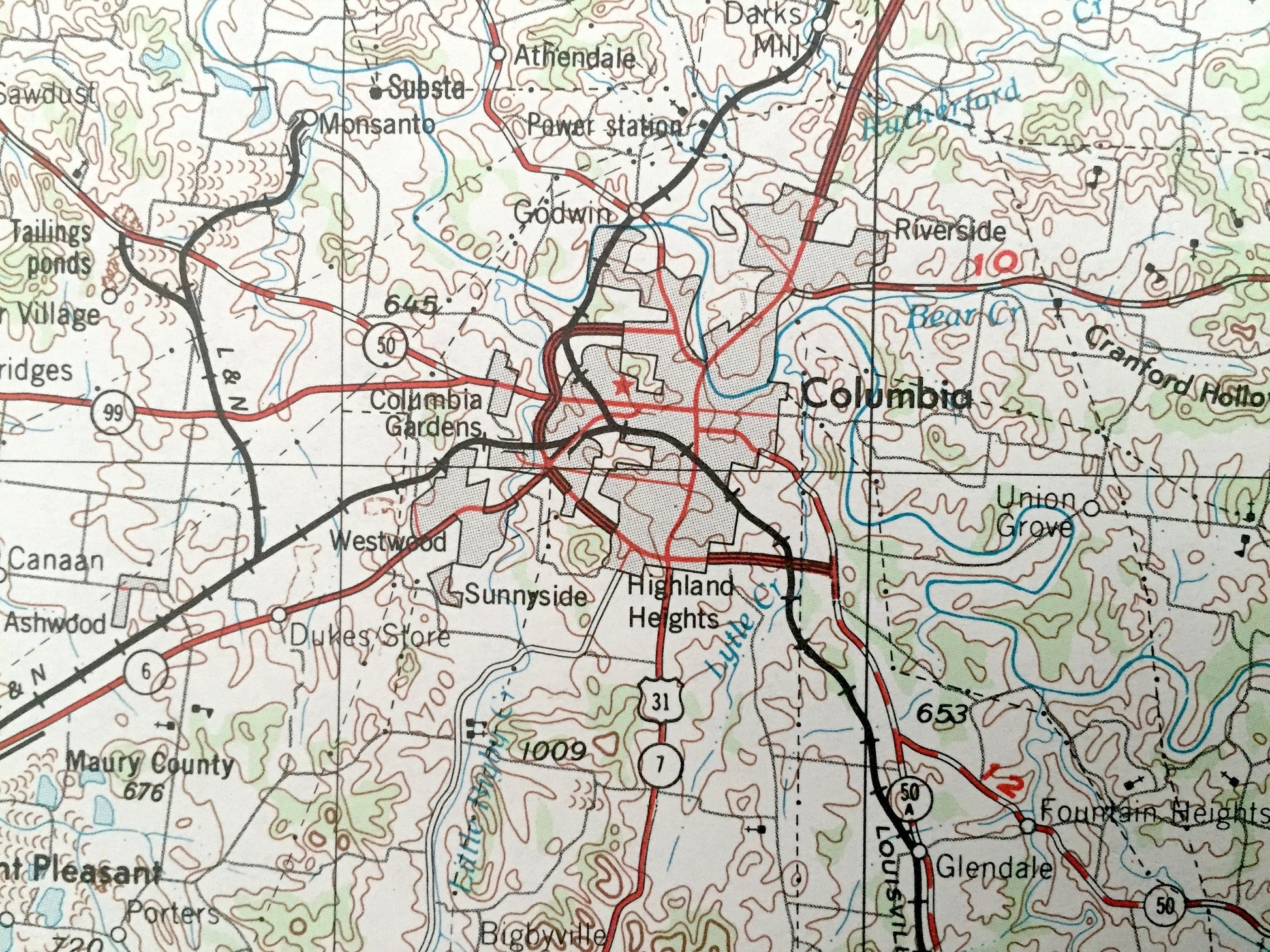 Beautiful, antique map of Columbia, Tennessee and surrounding Alabama areas. This is an authentic 1956 edition, 1979 print from the U.S. Geological Survey and NOT a computer reproduction.