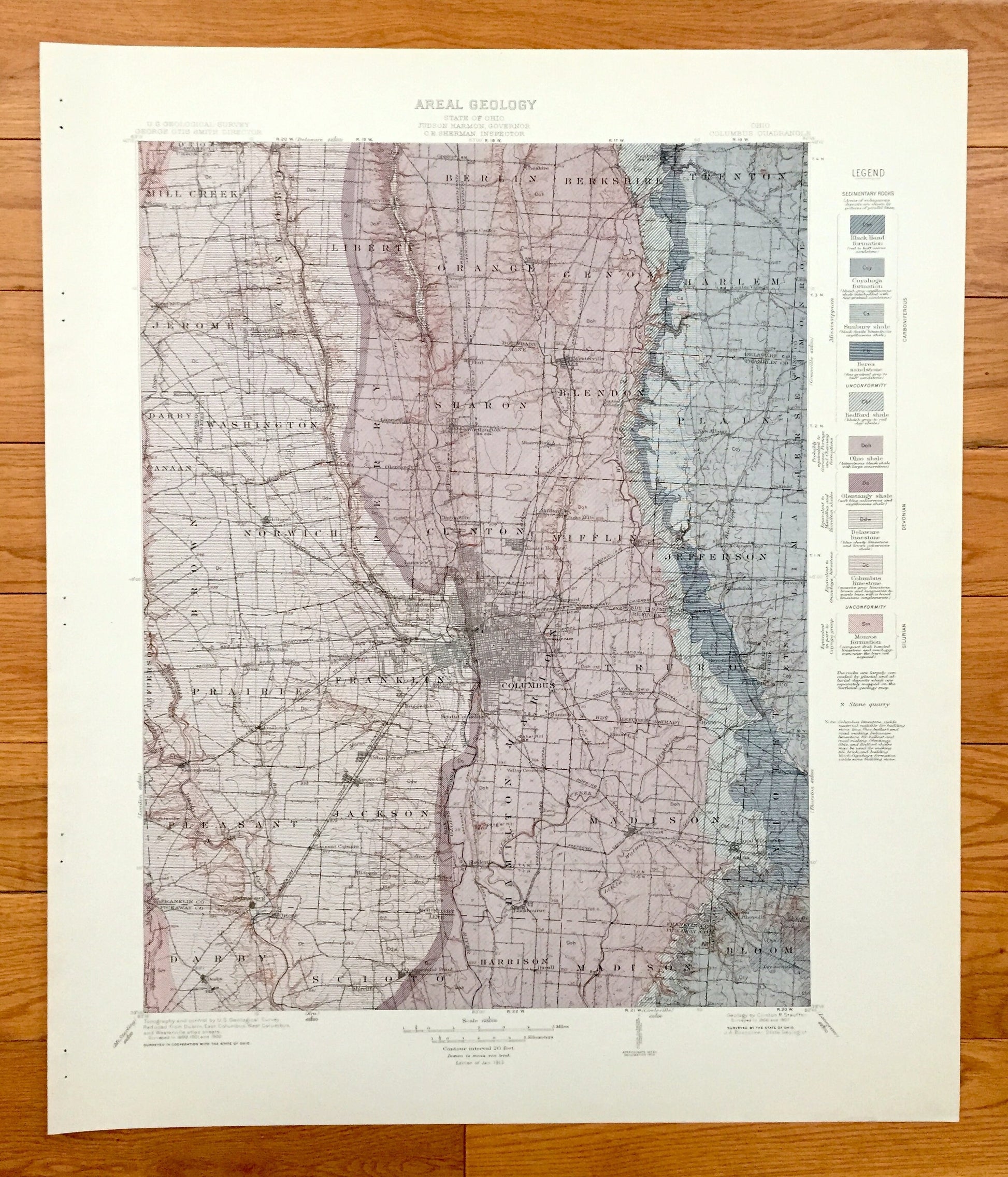 Beautiful, antique aerial map of the sedimentary rock formations of Columbus, Ohio and surrounding Franklin, Pickaway, Union, Madison, and Delaware County area. This is an authentic 1912 edition, 1913 print from from a U.S. Geological Survey folio and NOT a computer reproduction.
