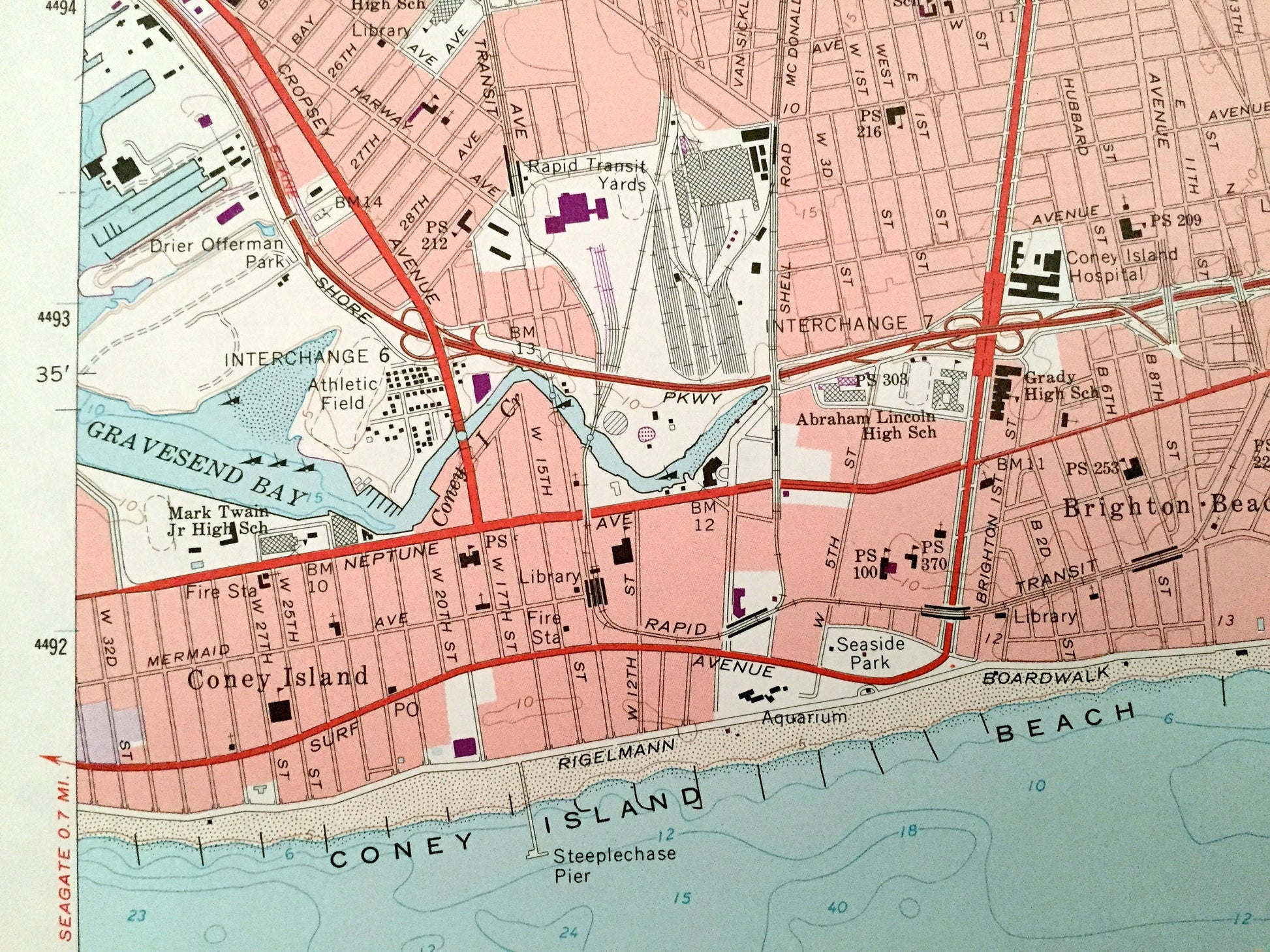 Points of Interest: Atlantic Ocean, Coney Island Beach, Rockaway Point Yacht Club, US Army Reserve Center, Jacob Riis Park, Gateway National Recreation Area, US Naval Air Station, Dead Horse Bay, US Coast Guard Station, Brooklyn Marine Park, Jamaica Bay, Bergen Beach Yacht Club, Gravesend Bay, Riegelmann Boardwalk, Canarsie Park, Island Channel, Plumb Beach, Kingsborough Community College, and many more hills, streams, ponds, houses, schools, railroads, churches and roads.
