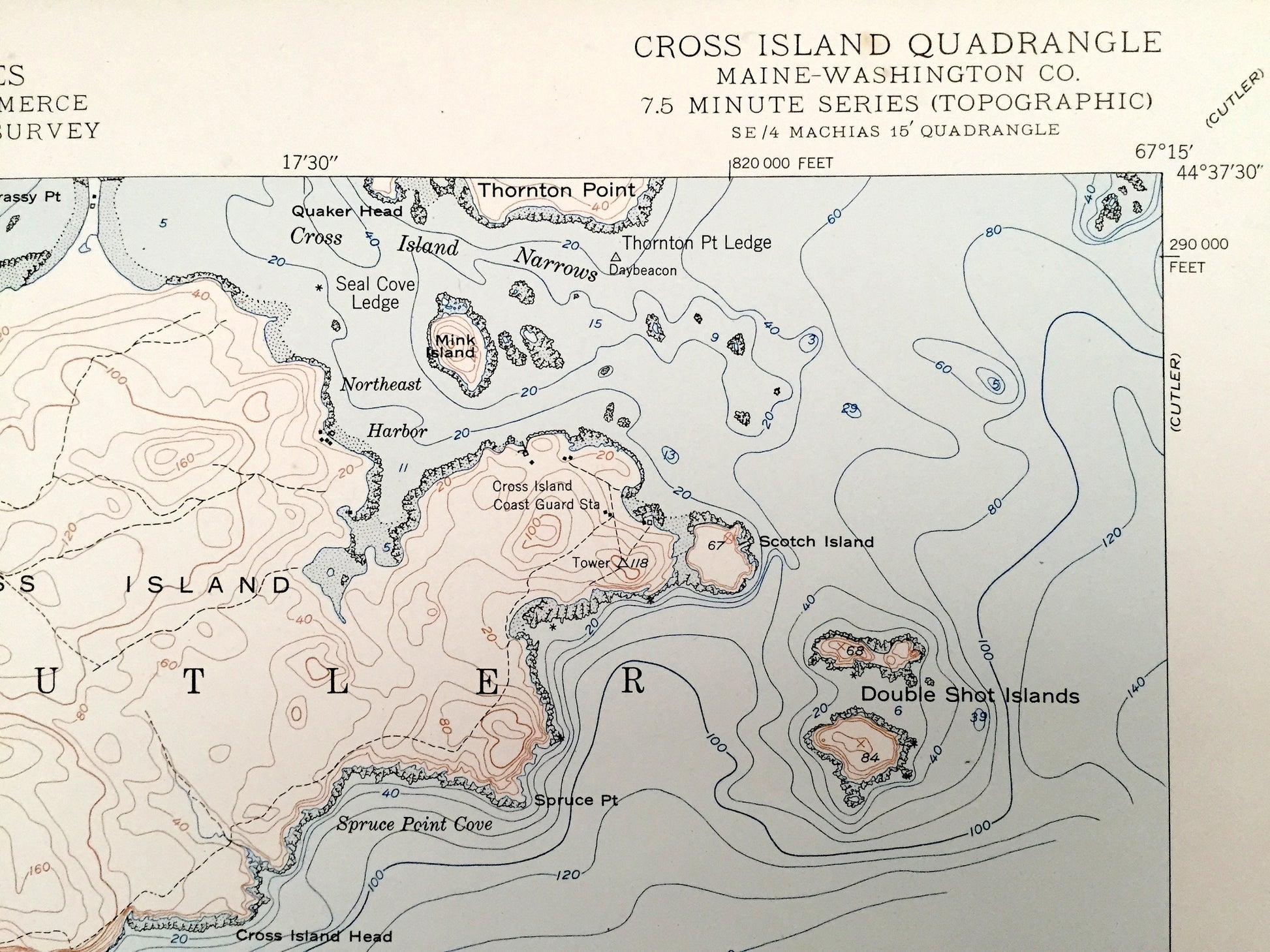 Points of Interest: Coast Guard Station, Stone Island, Libby Islands, Thornton Point, Double Shot Islands, Mink Island, Scotch Island, Machias Bay, Gulf of Maine, Atlantic Ocean, Northwest Harbor, Northeast Harbor, Spruce Point Cove, Grassy Point, Spruce Point, and many more hills, streams, beaches, islands, ponds, houses, schools, railroads, churches and roads.