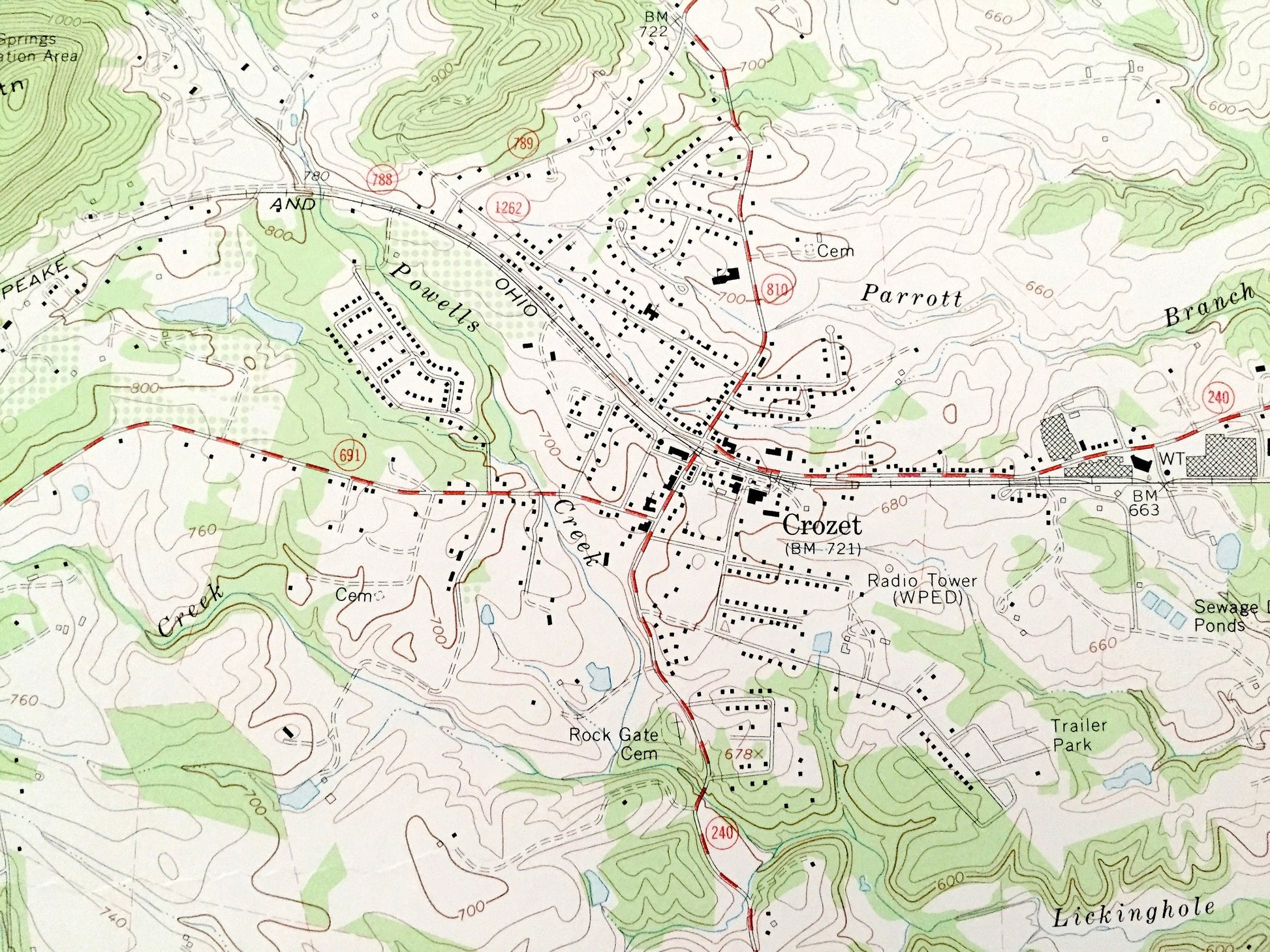 Beautiful, antique map of Crozet, Virginia and surrounding Albemarle County area. This is an authentic 1973 edition, 1974 print from the U.S. Geological Survey and NOT a computer reproduction.