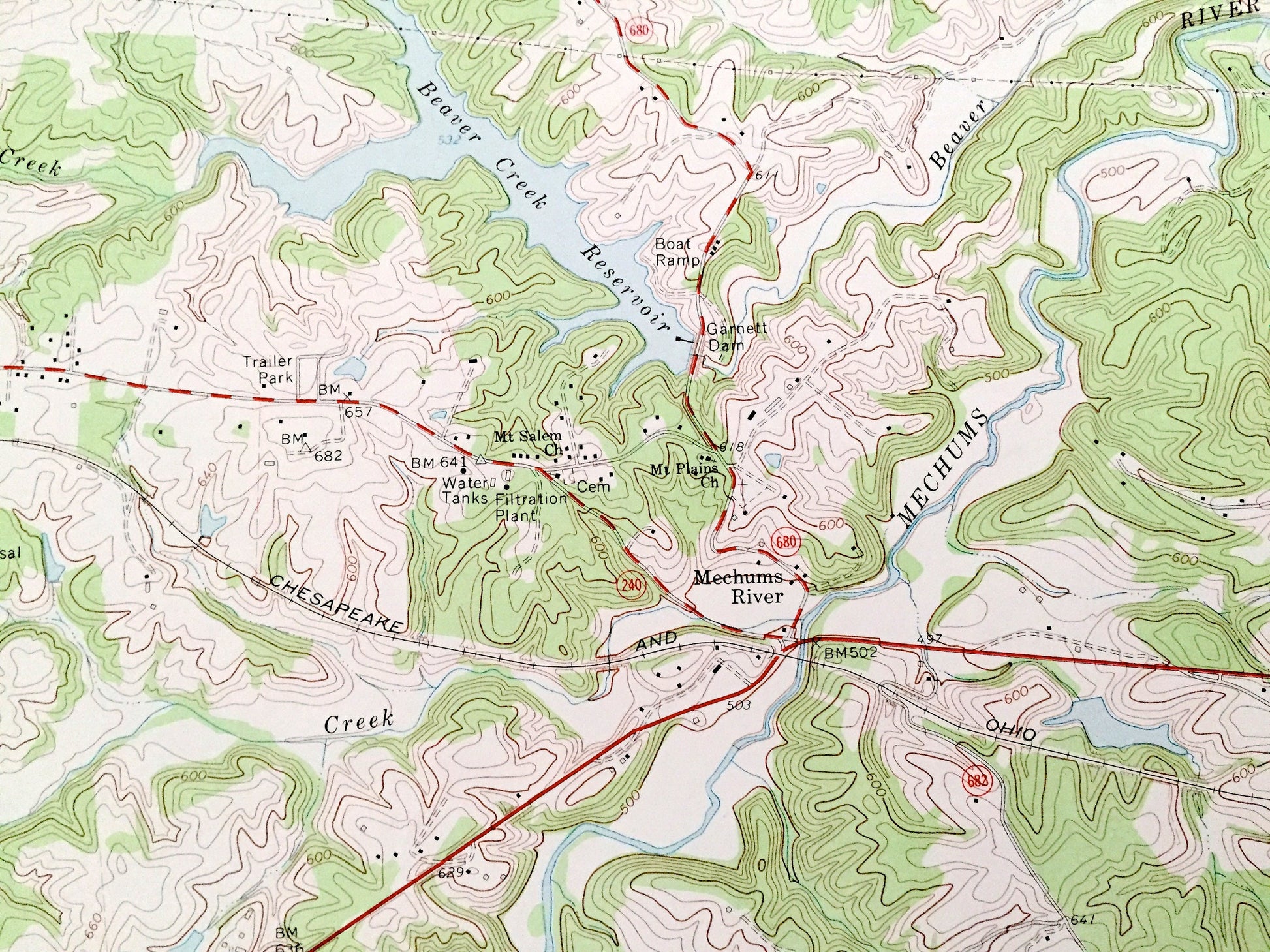 Points of Interest: Albermarle County, Bucks Elbow Mountain, Little Yellow Mountain, Gillums Mountain, Mechums River, Lake Albemarle, Chesapeake & Ohio Railway, Beaver Creek Mountain, Meadow Branch Hollow, Beaver Creek Reservoir, and many more hills, streams, ponds, houses, schools, churches and roads.