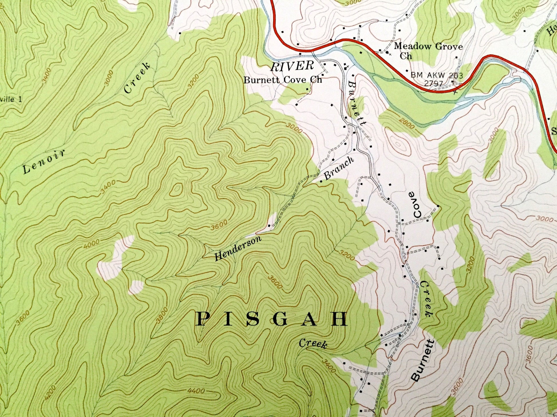 Points of Interest: Pisgah National Forest, Cold Mountain, Spring Mountain, Henson Cove, Poison Cove, Sugar Top, Twelve O’Clock Top, Rocky Face Mountain, White Rock Mountain, Stairs Mountain, Johns Cove, Shining Rock, The Narrows Ledge, Roland Ridge, Piney Field Top, Fork Mountain, Ripshin Mountain, Mt Pisgah, Pisgah Ridge, The Pink Beds, Fryingpan Mountain, Flat Laurel Gap, East Fork Pigeon River, Bens Ridge, Poison Cove Branch, Garden Creek, Dutch Cove Creek, Warren Creek, White Rock Branch, South Hominy Creek, Sams Branch, Harley Branch, Chinquapin, Pisgah Creek, Crawford Creek, Poplar Creek, and many more hills, streams, ponds, houses, schools, railroads, churches and roads.