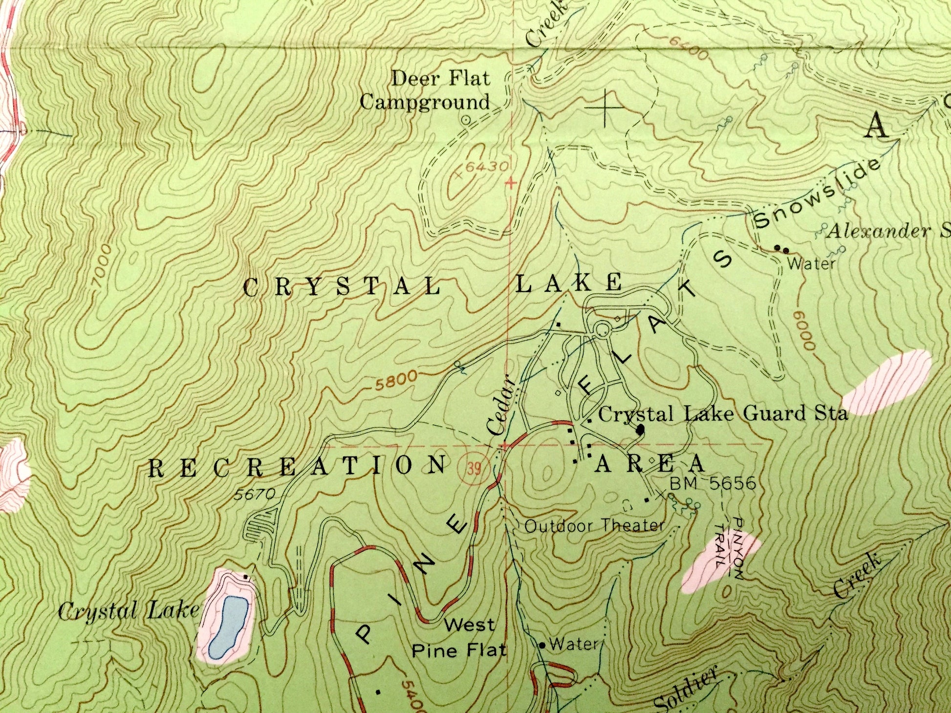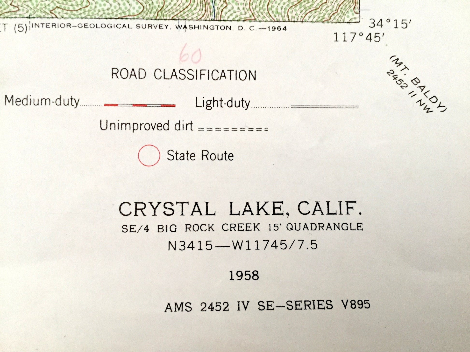 Points of Interest: Crystal Lake, Angeles National Forest, Crystal Lake Recreation Area, North Fork San Gabriel River, Smith Mountain, Lost Canyon, Burro Peak, Burro Canyon, Susanna Canyon, Bichota Canyon, Graveyard Canyon, Rattlesnake Peak, Rattlesnake Canyon, Shoemaker Canyon, Maple Canyon, Pigeon Ridge, Devil Gulch, Alpine Canyon, Cloudburst Canyon, Rockbound Canyon, South Mt Hawkins, Copter Ridge, Ross Mountain, Pine Flats, Deer Flat Campground, Snowslide Canyon, Mt Williamson, Mt Islip, Windy Gap, Pine Hollow Picnic Area, Little Jimmy Campground, Outdoor Theater, Mt Hawkins, Throop Peak, Lodgepole Picnic Area, Mt Burnham, Mt Baden-Powell, and lots more hills, mountains, ravines, creeks, houses, canals, roads and camps.