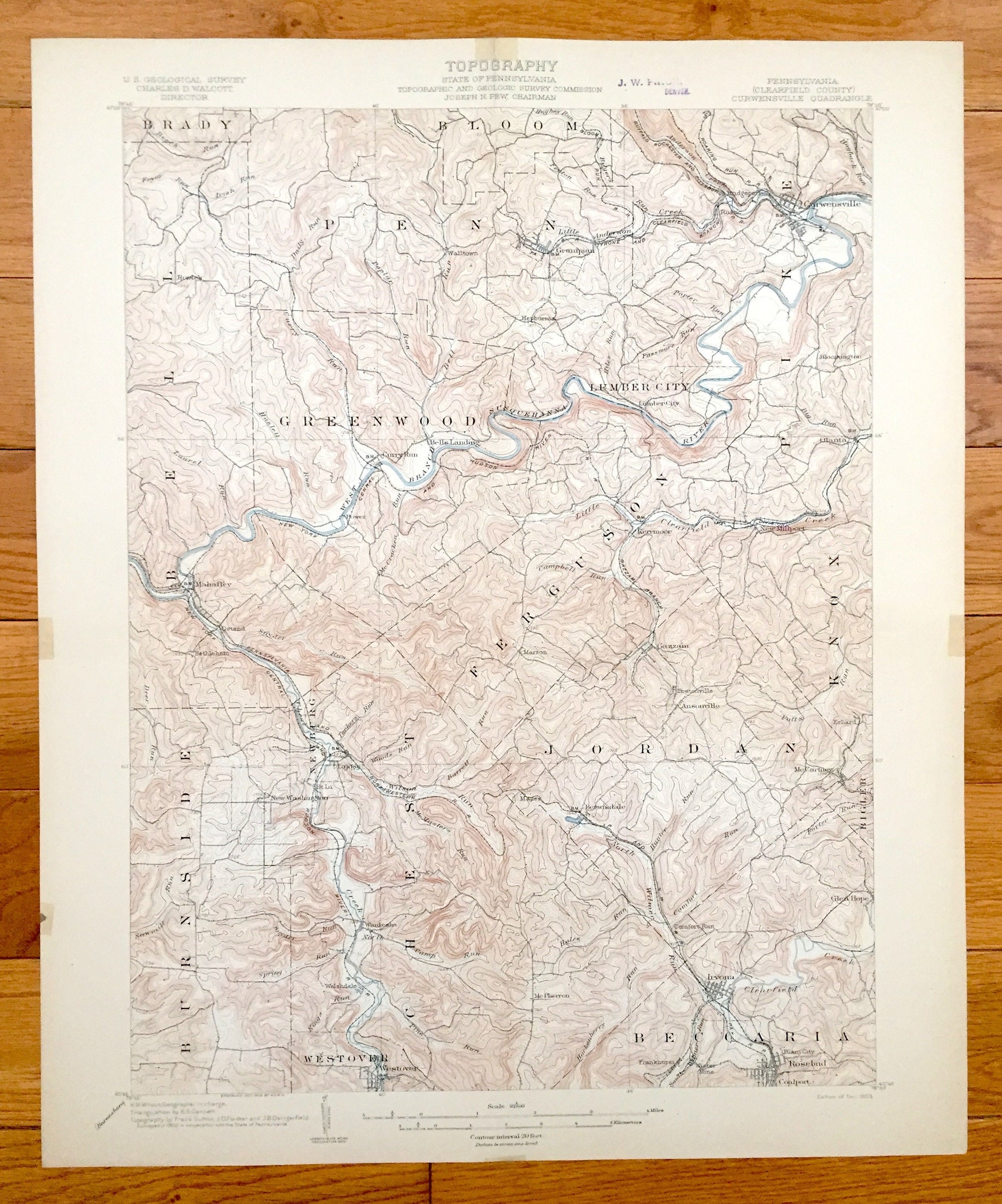 Points of Interest: West Branch Susquehanna River, Pennsylvania Railroad, New York Central & Hudson River Railroad, Little Clearfield Creek, Pennsylvania & Northwestern Railroad, Anderson Creek, and lots more hills, mountains, creeks, towns, roads and train tracks.