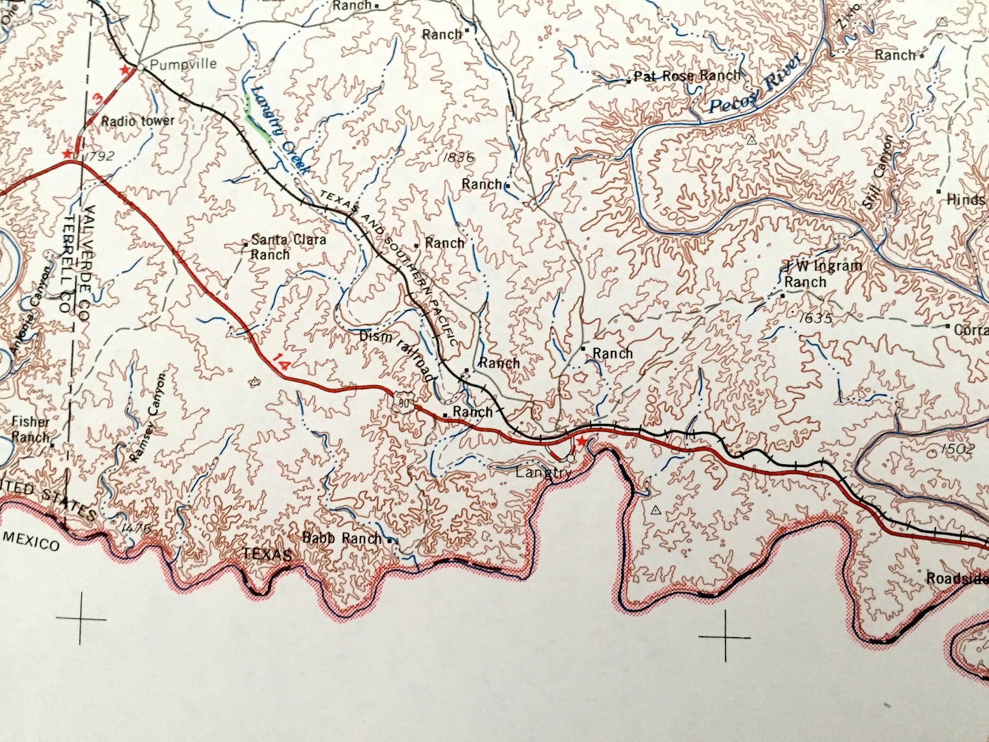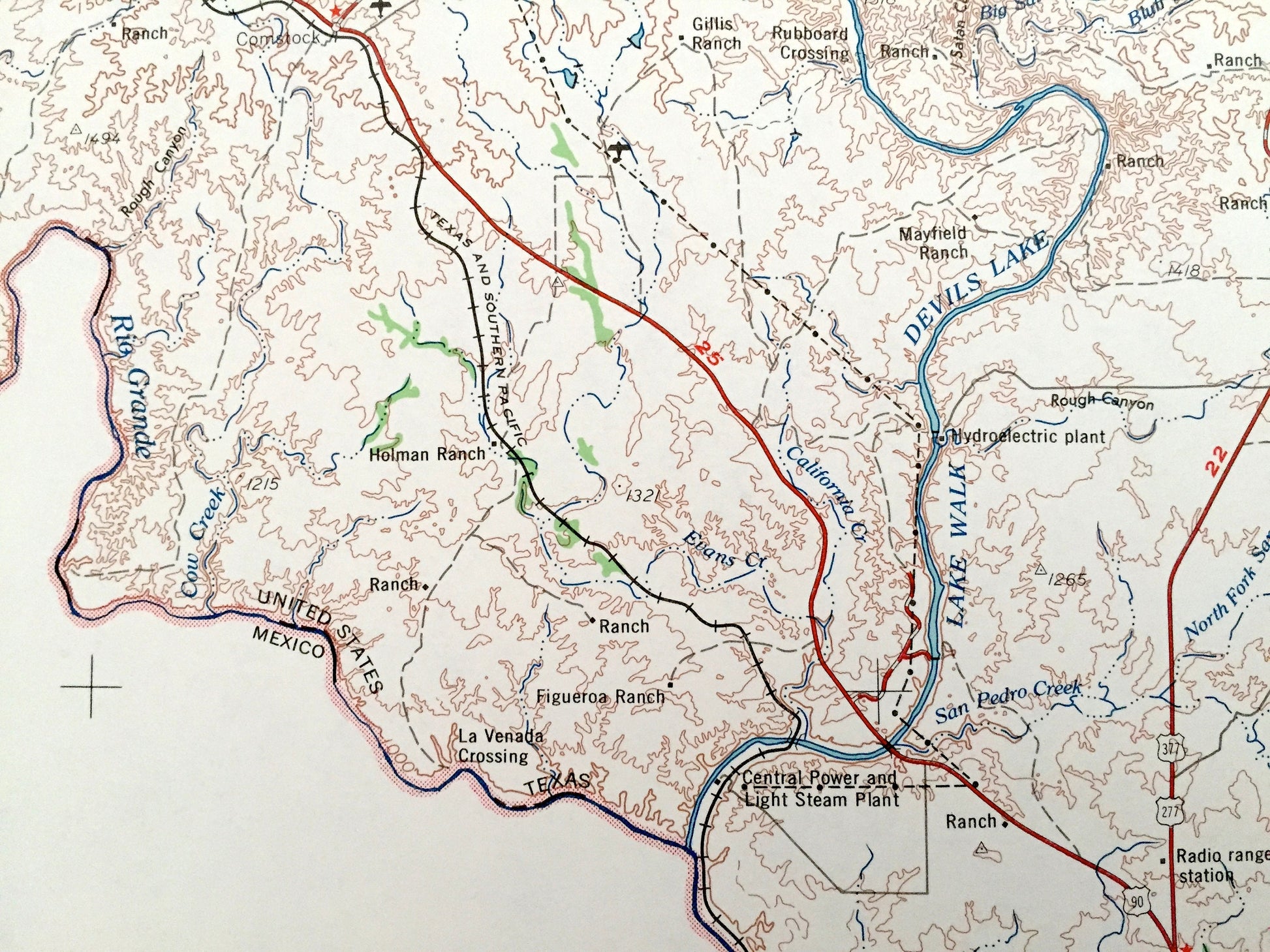 Points of Interest: Rio Grande, Amistad Reservoir, Devils River, Pecos River, West Nueces River, Las Moras Creek, Mud Creek, Pinto Creek, Mexico and lots more hills, mountains, rivers, lakes, creeks, roads, highways and railroads.