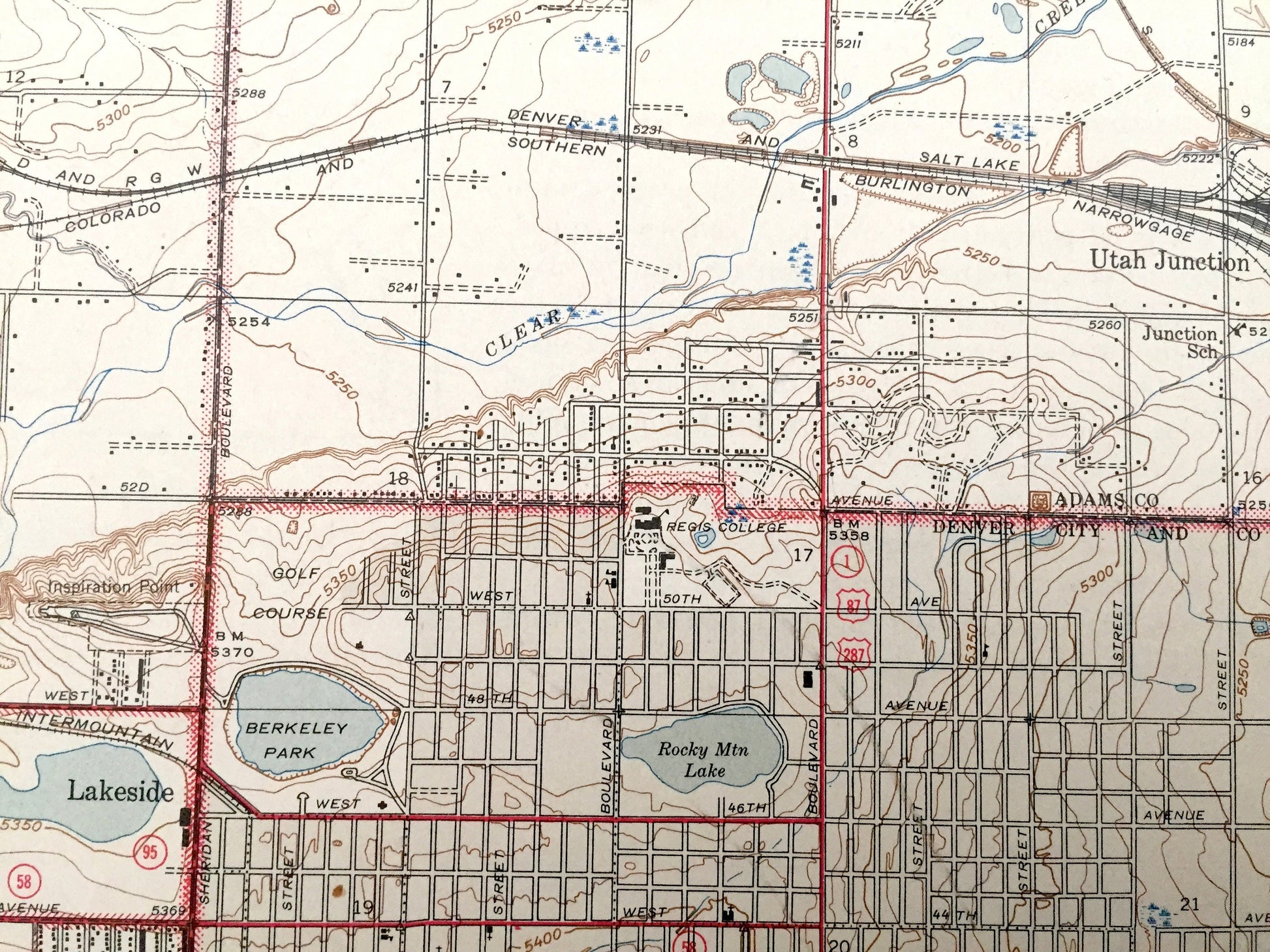 Points of Interest: Jefferson County, Adams County, Denver County, Clear Creek, Standley Lake, Pamona Lake, Conklin Lake, Church Lake, Mud Lake, Van Bibber Creek, Regis College, Sloan Lake, South Platte River, Berkeley Park, Rocky Mountain Lake, Bellevue College, and many more smaller ponds, streams, houses, schools, roads, churches and train tracks.
