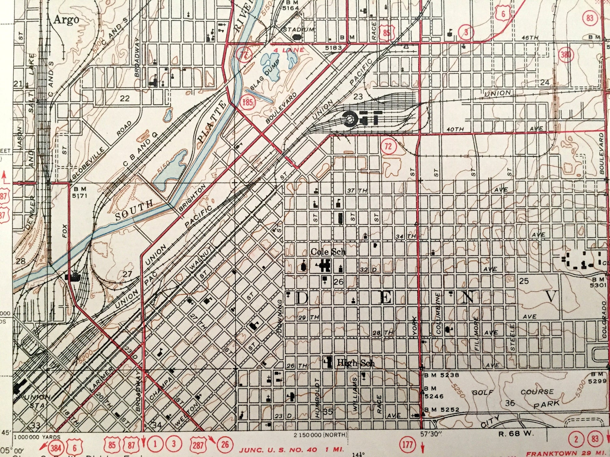 Points of Interest: Adams County, Denver County, South Platte River, Clear Creek, Sand Creek, Retreat Park, Municipal Airport, Croke Lake , and many more smaller ponds, streams, houses, schools, roads, churches and train tracks.